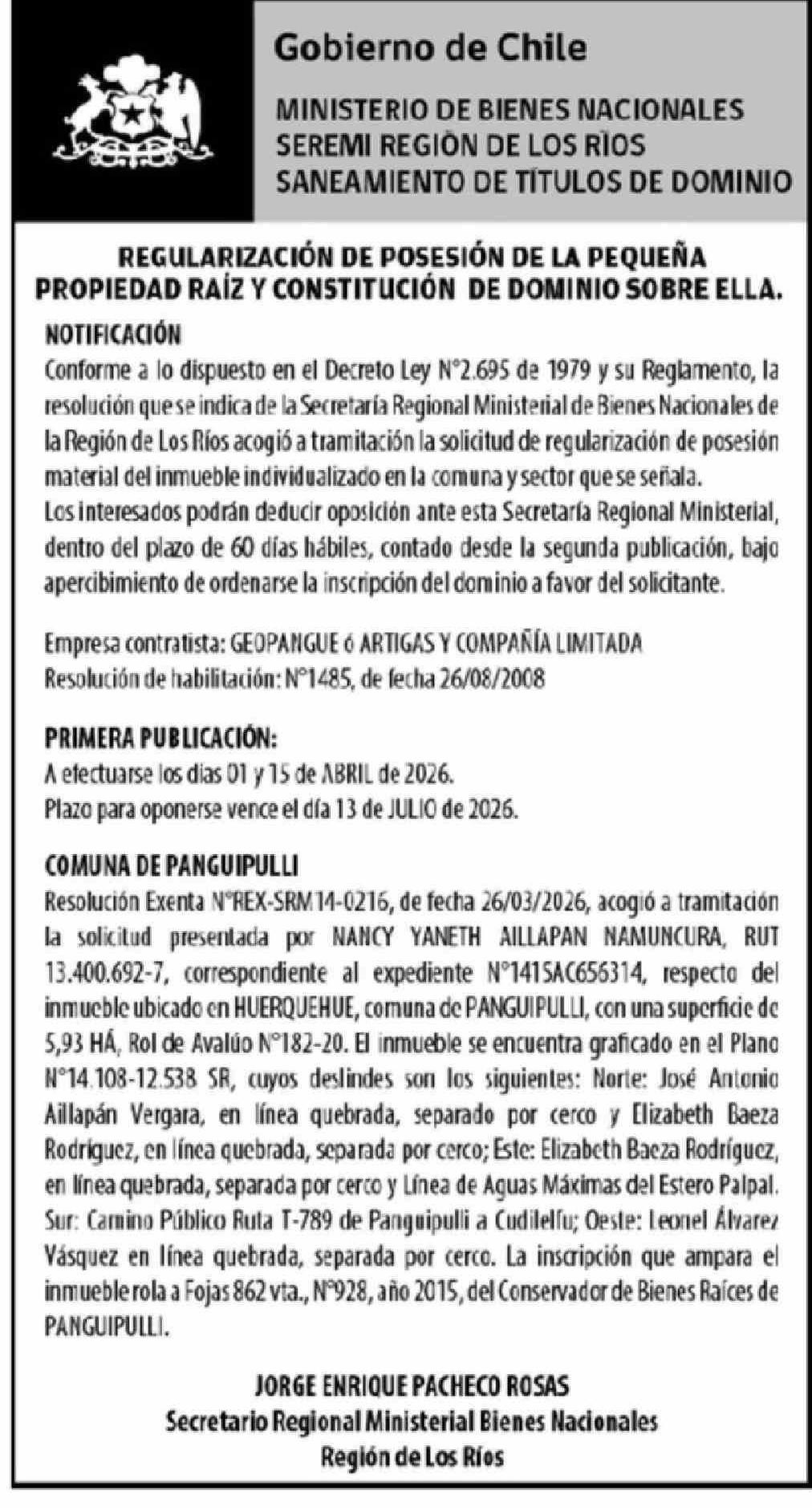 Extractos: Gobierno de Chile MINISTERIO DE BIENES NACIONALES SEREMI REGION DE LOS RIOS SANEAMIENTO DE TÍTULOS DE DOMINIO