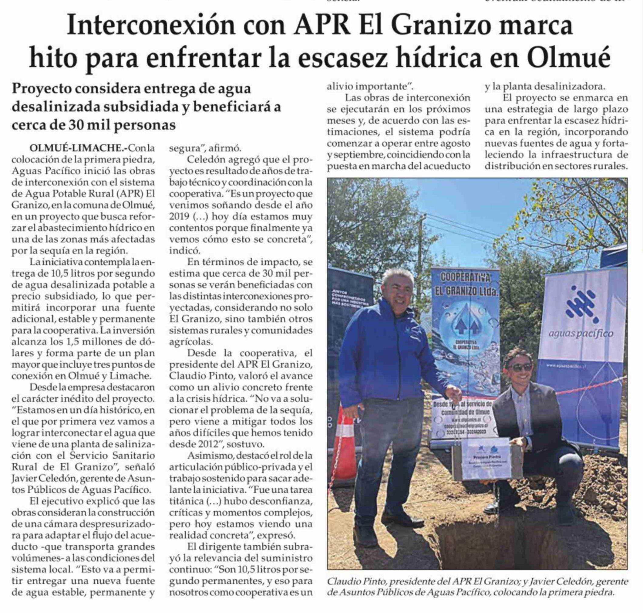 Interconexión con APR El Granizo marca hito para enfrentar la escasez hídrica en Olmué