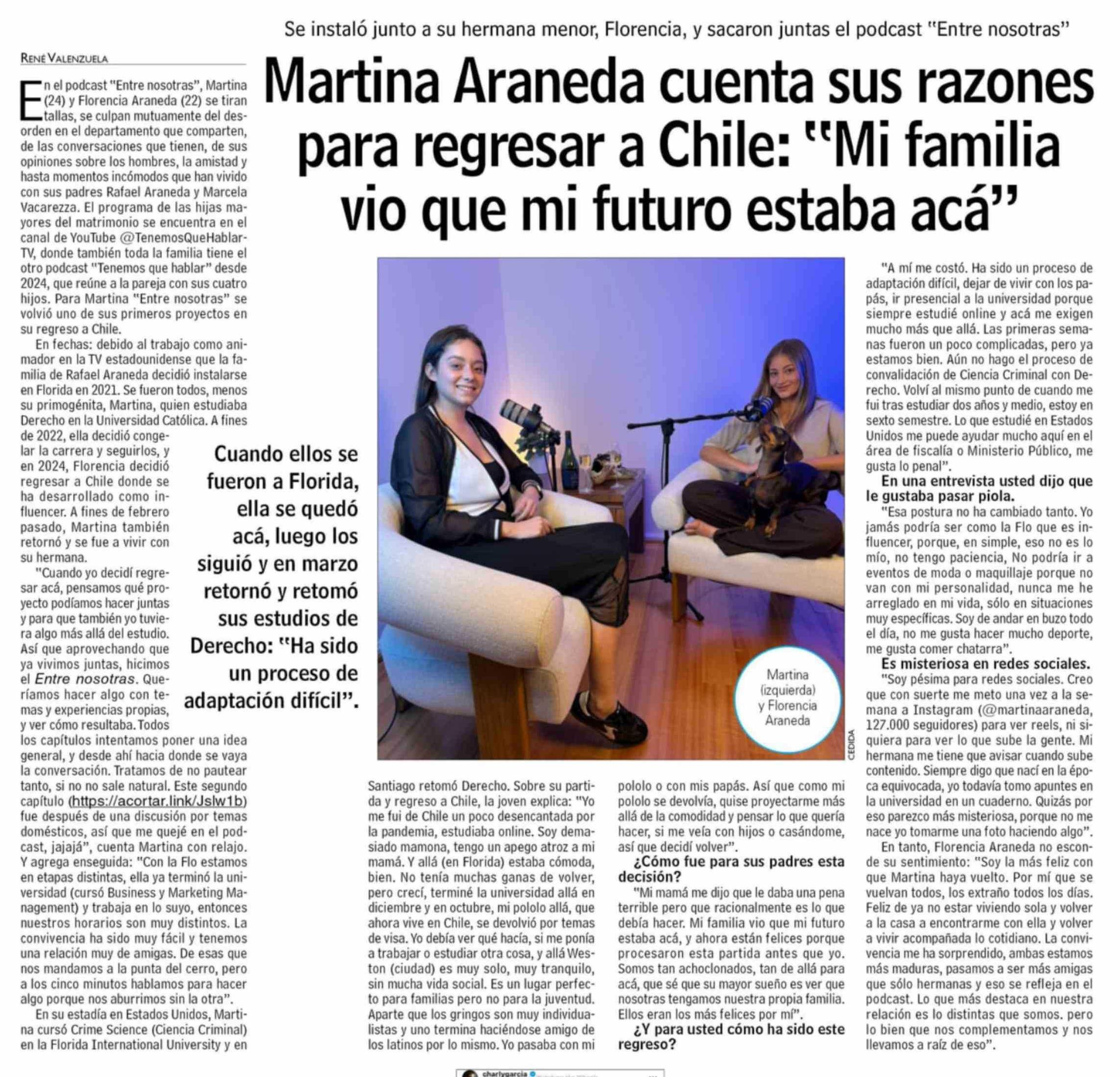 Título: Martina Araneda cuenta sus razones para regresar a Chile: "Mi familia vio que mi futuro estaba acá"