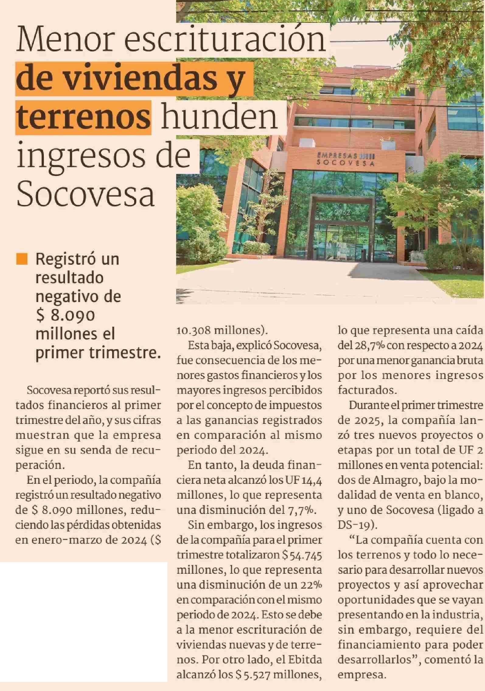 Menor escrituración de viviendas y terrenos hunden ingresos de Socovesa
