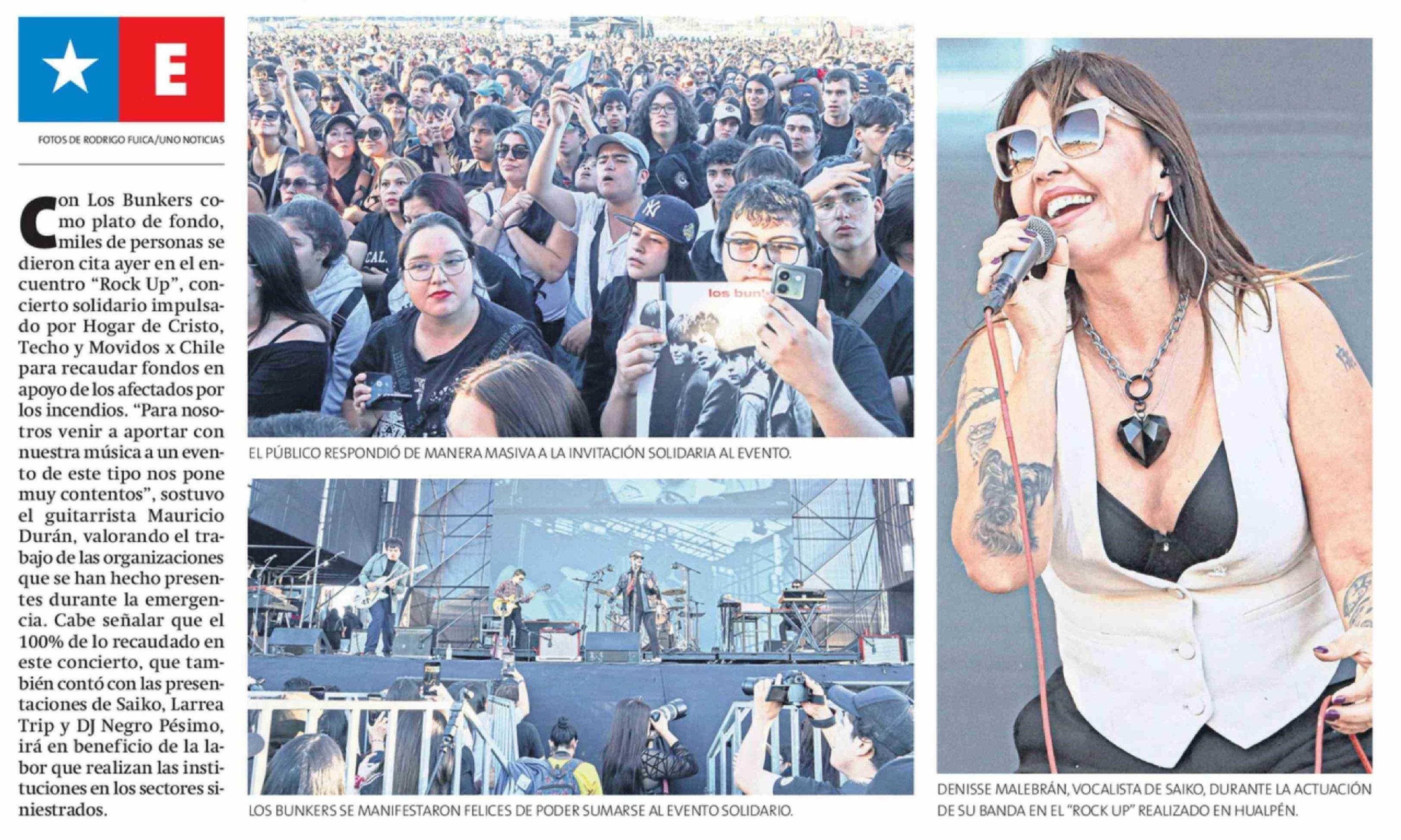 Título: miles de personas se dieron cita ayer en el encuentro "Rock Up", concierto solidario impulsado por Hogar de Cristo, Techo y Movidos x Chile para recaudar fondos en apoyo de los afectados por los incendios. "Para nosotros venir a aportar con nuestra música a un evento de este tipo nos pone muy conten