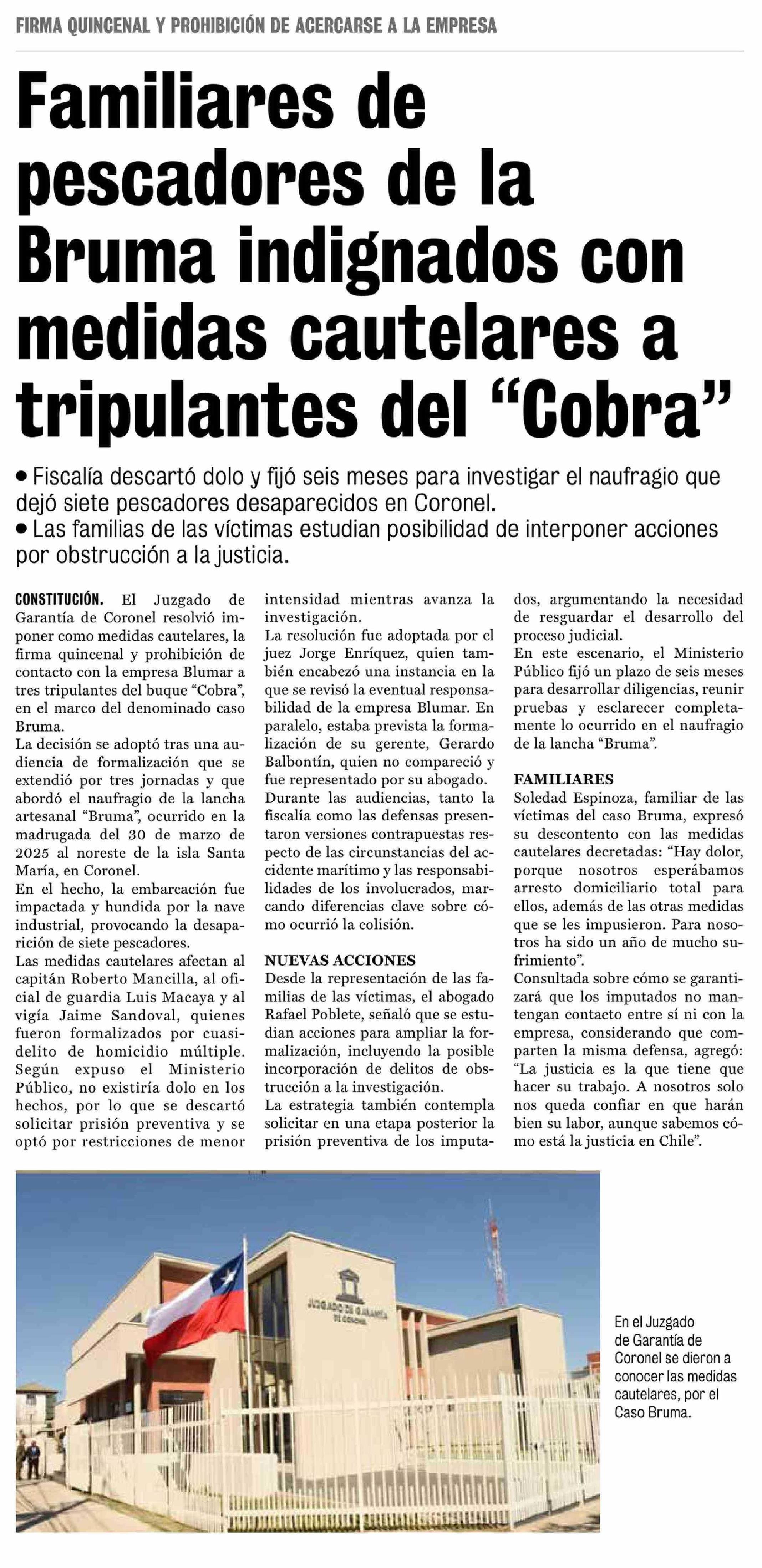 Familiares de pescadores de la Bruma indignados con medidas cautelares a tripulantes del "Cobra"
