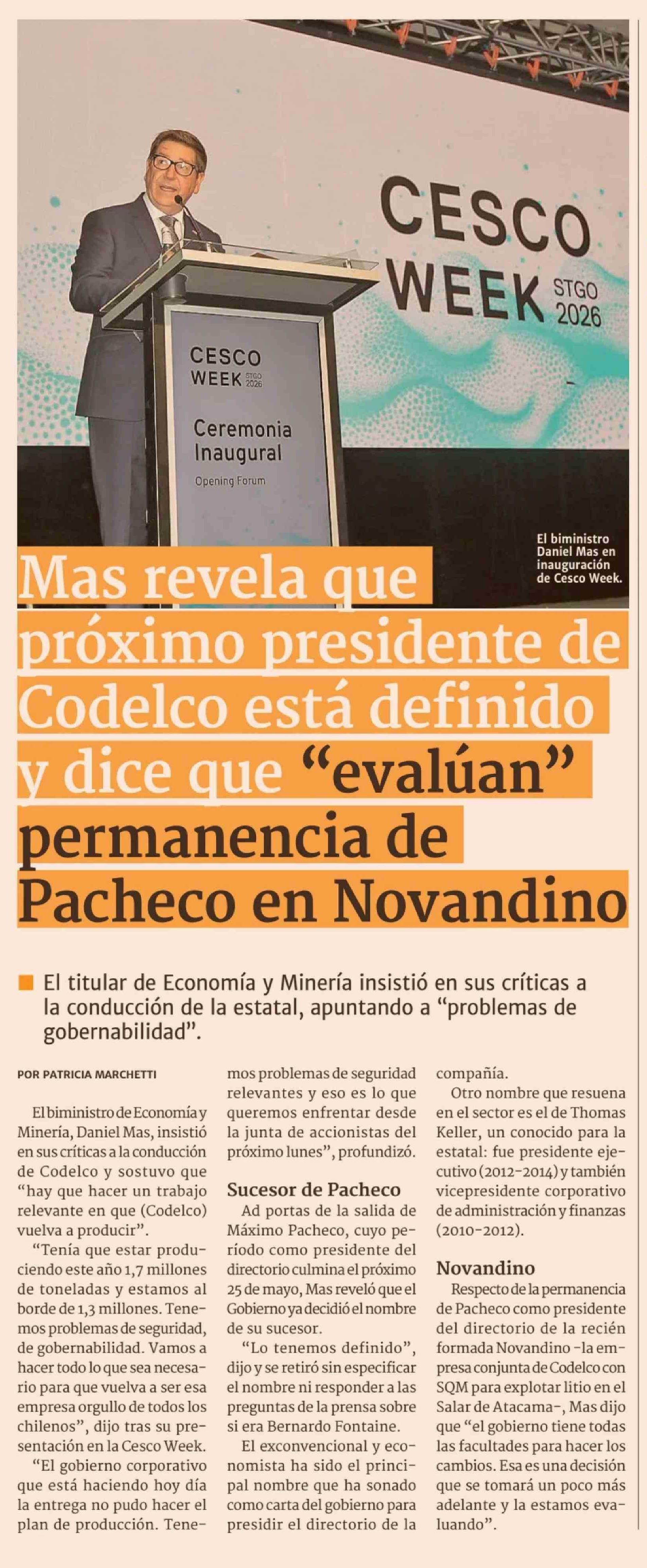 Mas revela que próximo presidente de Codelco está definido y dice que "evalúan" permanencia de Pacheco en Novandino