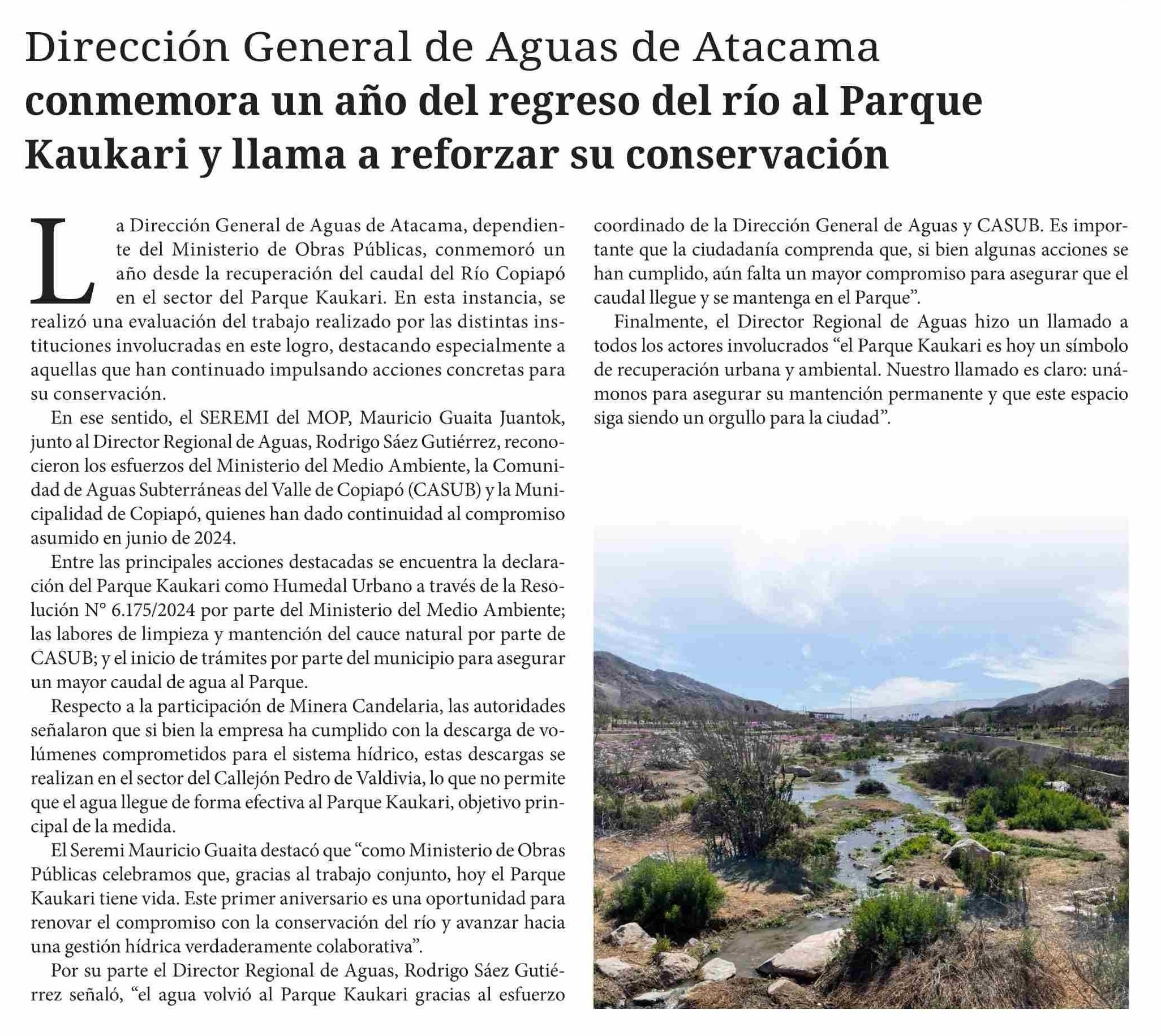 Dirección General de Aguas de Atacama conmemora un año del regreso del río al Parque Kaukari y llama a reforzar su conservación