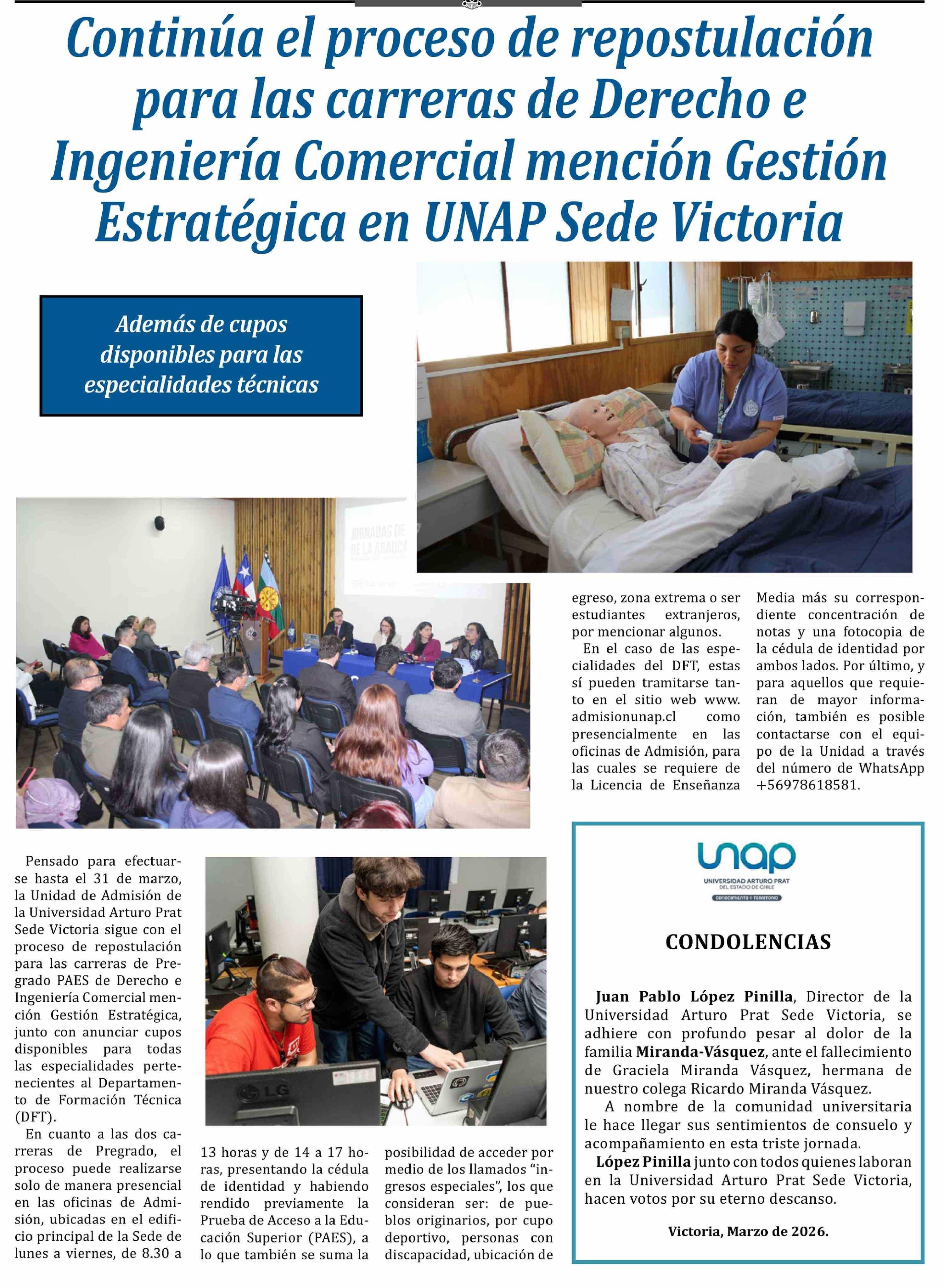 Continúa el proceso de repostulación para las carreras de Derecho e Ingeniería Comercial mención Gestión Estratégica en UNAP Sede Victoria