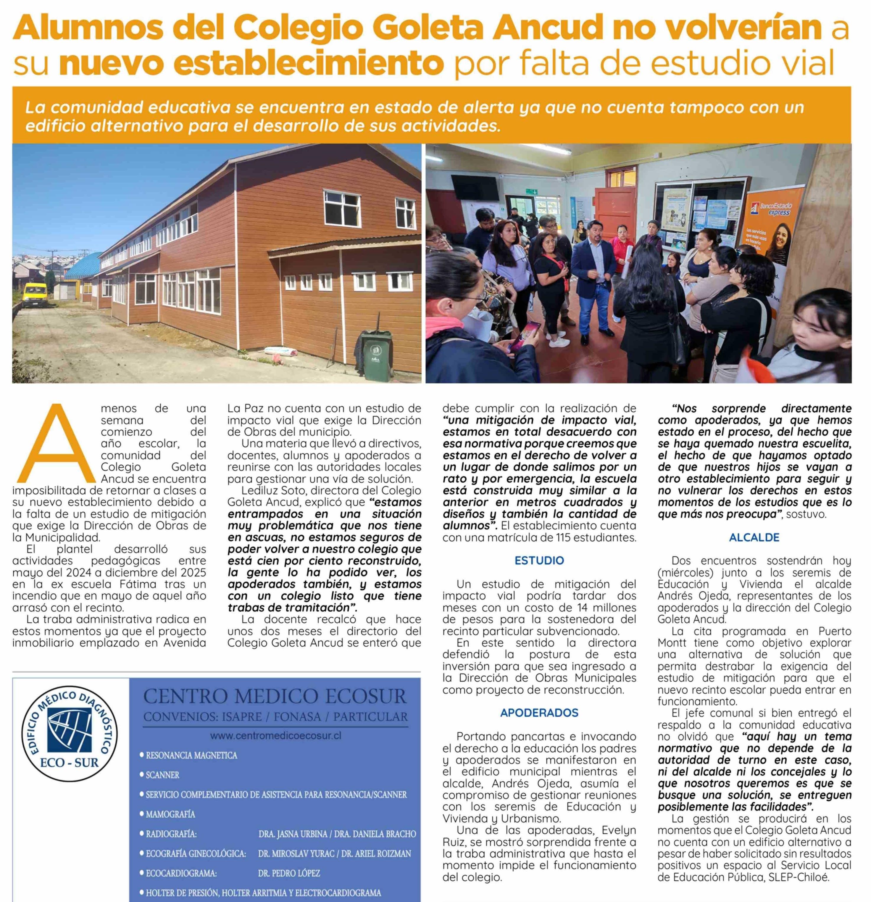 Alumnos del Colegio Goleta Ancud no volverían a su nuevo establecimiento por falta de estudio vial