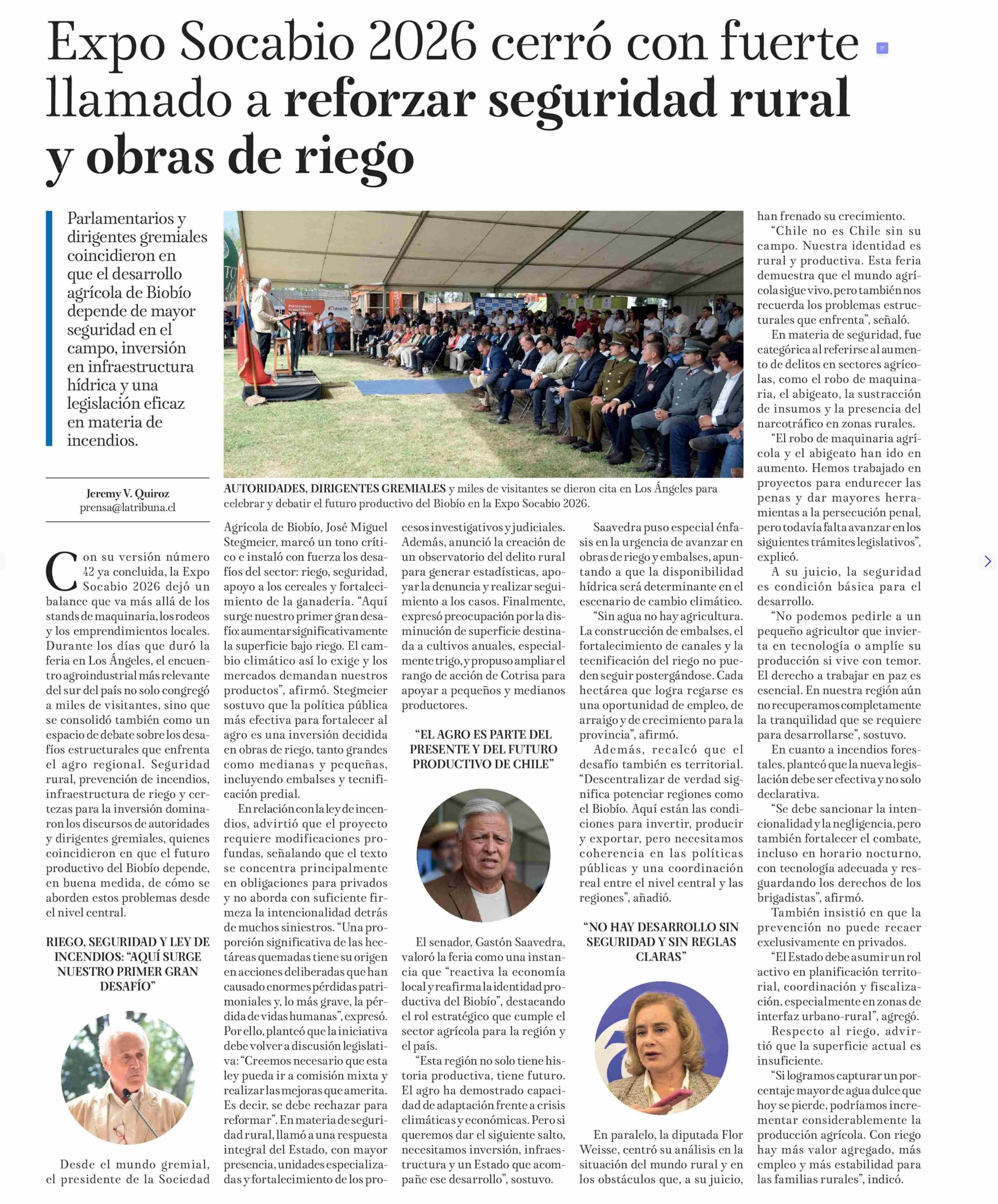 Expo Socabio 2026 cerró con fuerte. llamado a reforzar seguridad rural y obras de riego
