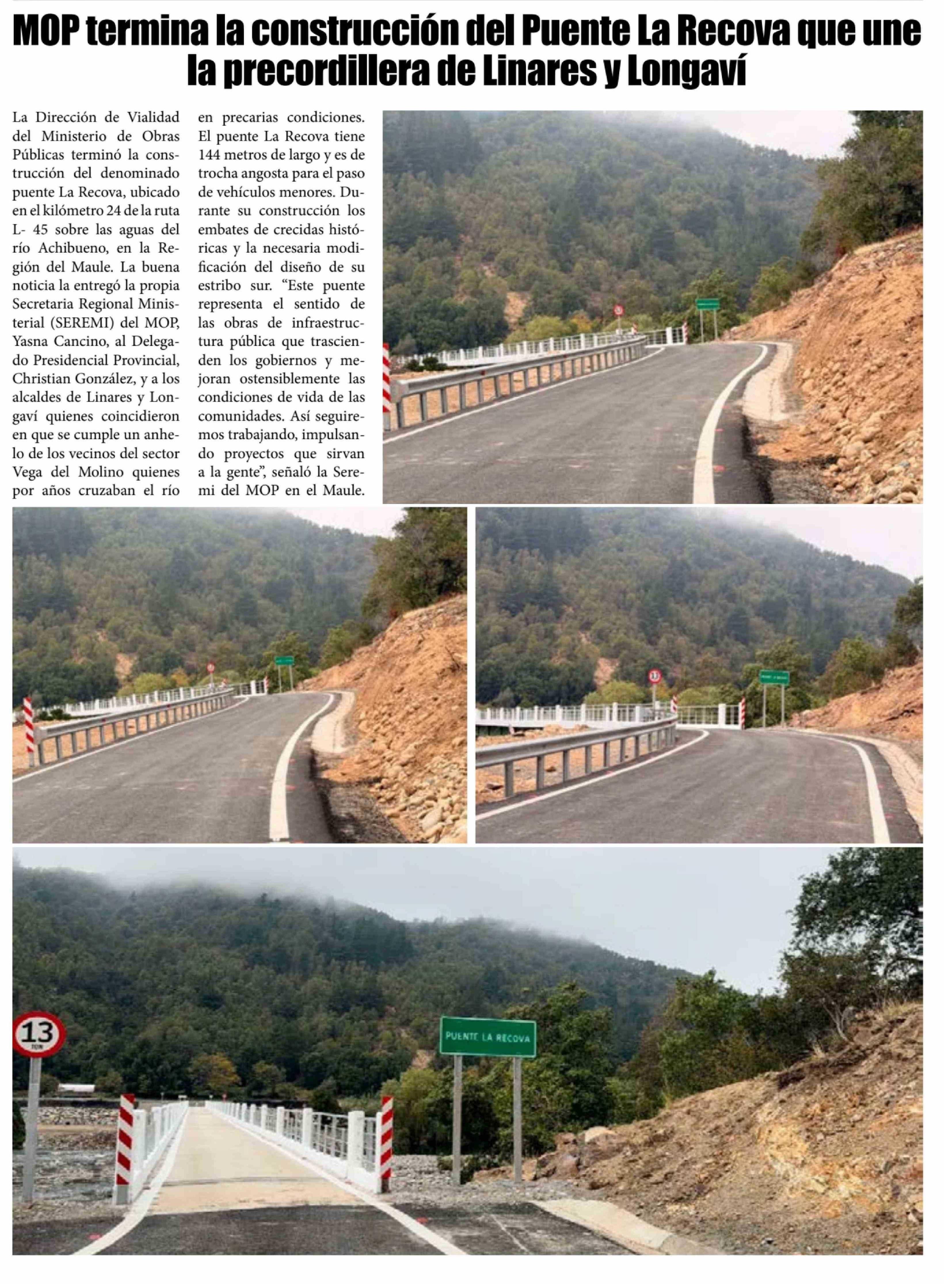 MOP termina la construcción del Puente La Recova que une la precordillera de Linares y Longaví