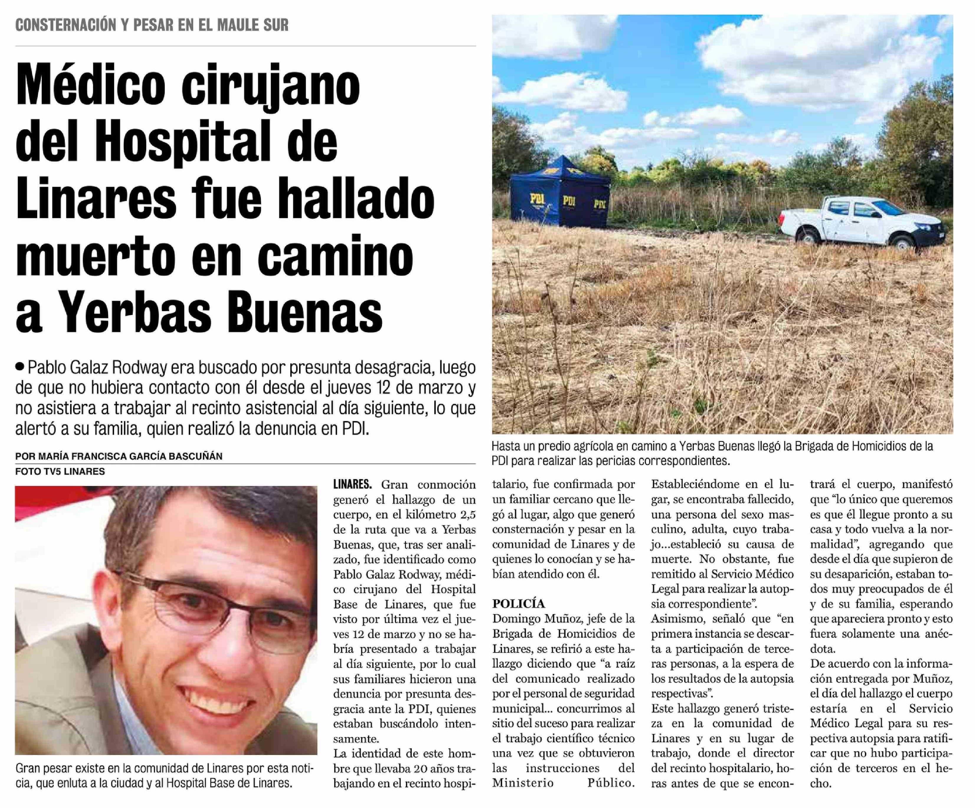 Médico cirujano del Hospital de Linares fue hallado muerto en camino a Yerbas Buenas