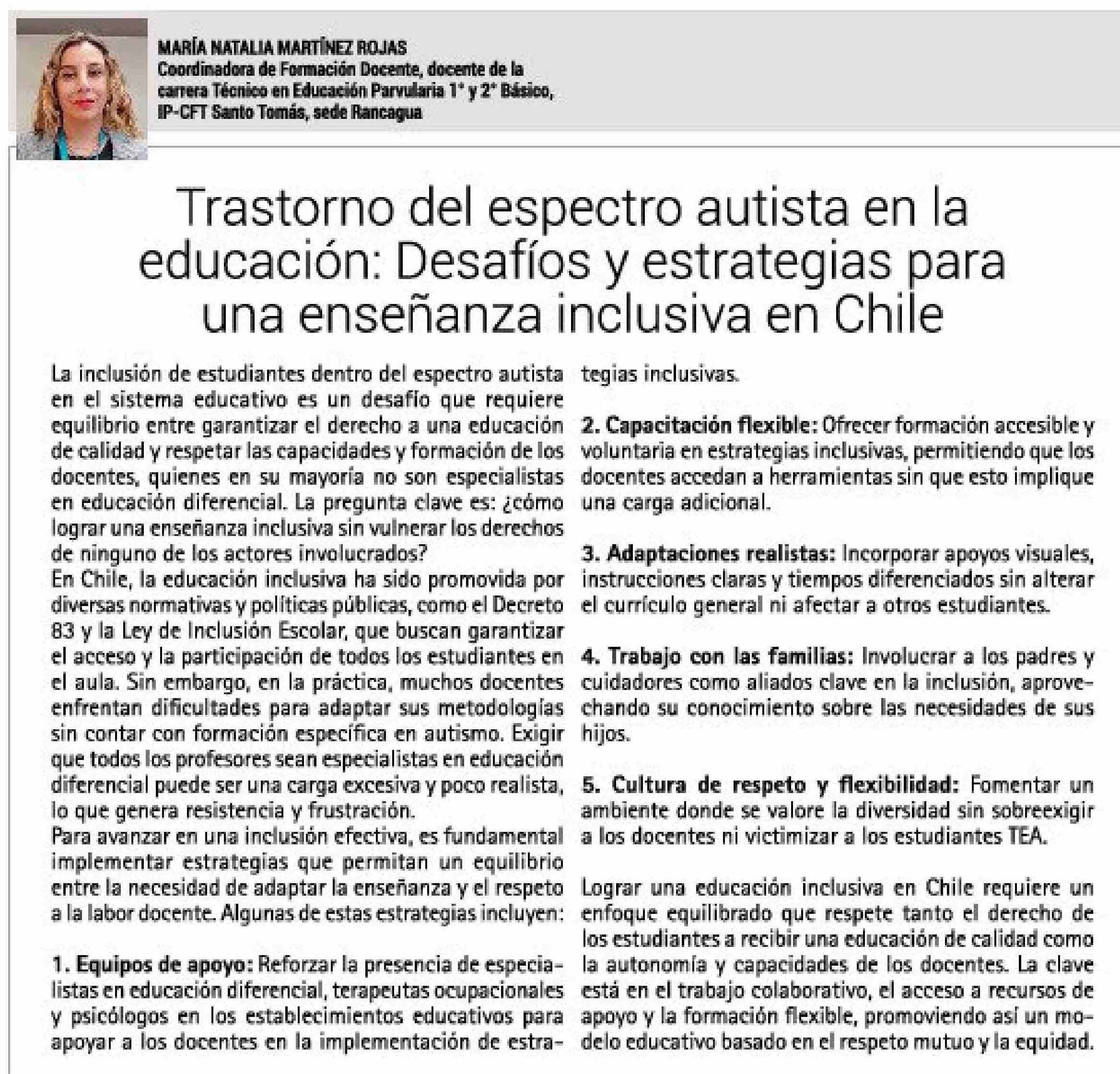 | Título: | Columnas de Opinión: Trastorno del espectro autista en la educación: Desafíos y estrategias para una enseñanza inclusiva en Chile |