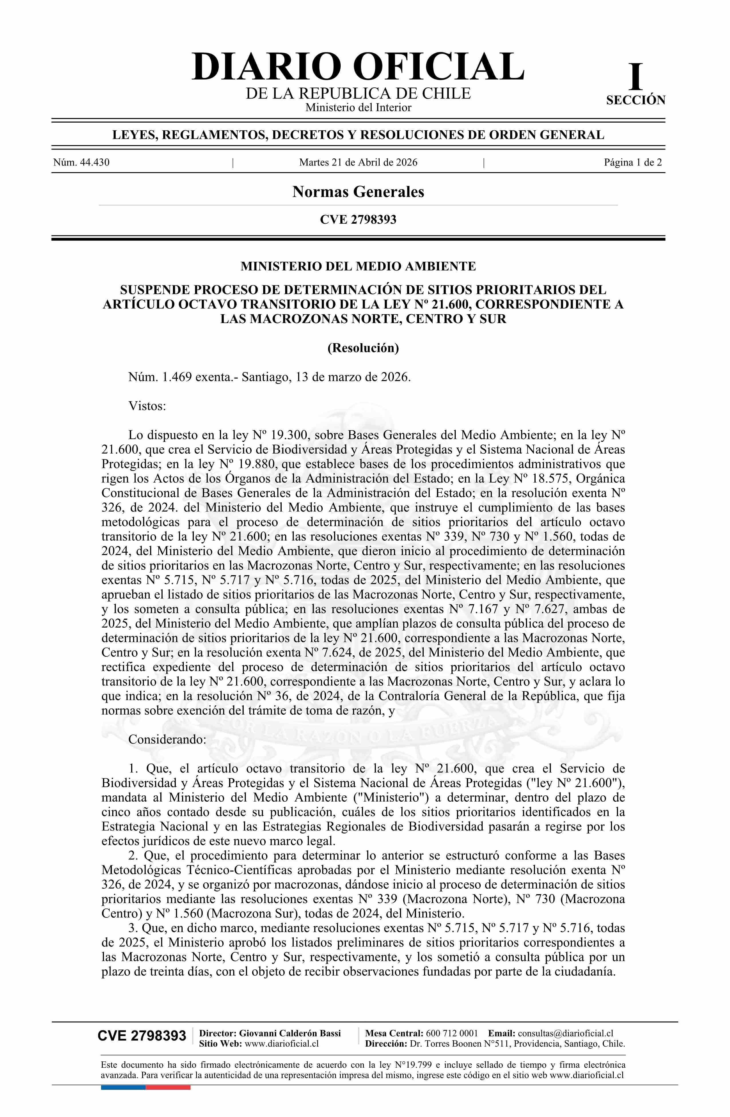 Título: Resolución exenta número 1.469, de 2026.- Suspende proceso de determinación de sitios prioritarios del artículo octavo transitorio de la ley Nº 21.600, correspondiente a las Macrozonas Norte, Centro y Sur