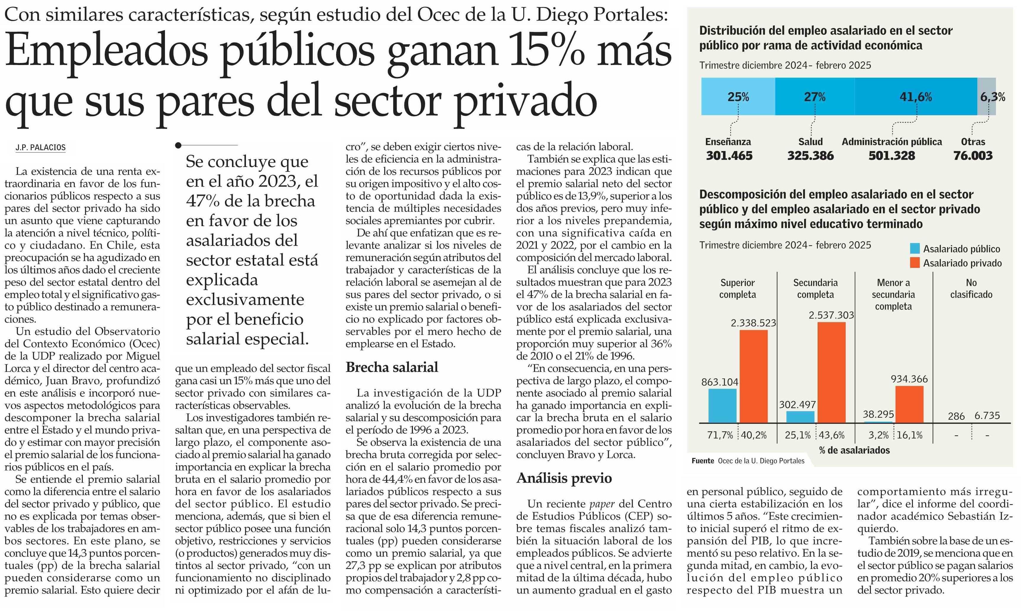 Empleados públicos ganan 15% más que sus pares del sector privado