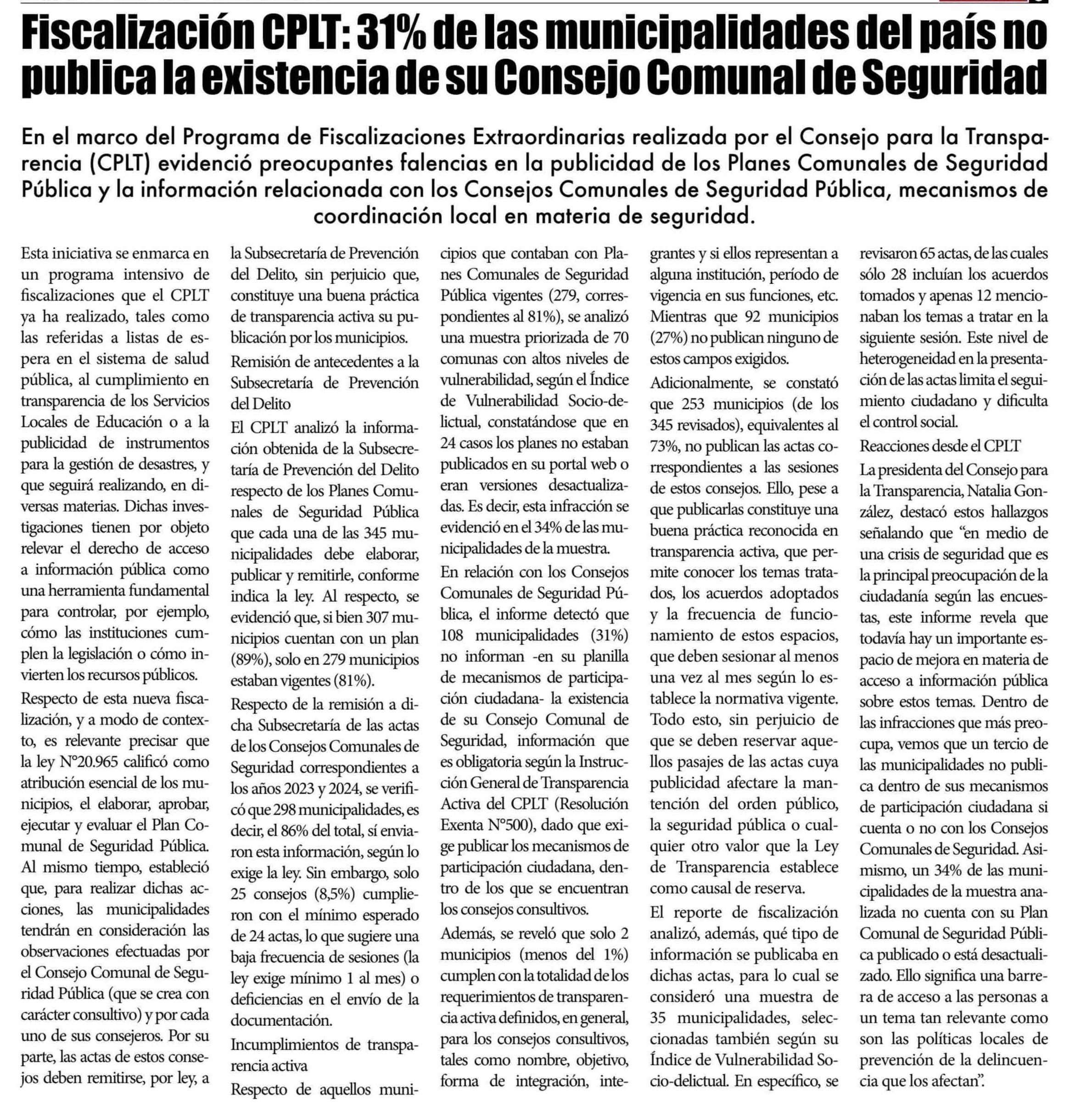 Fiscalización CPLT: 31% de las municipalidades del país no publica la existencia de su Consejo Comunal de Seguridad