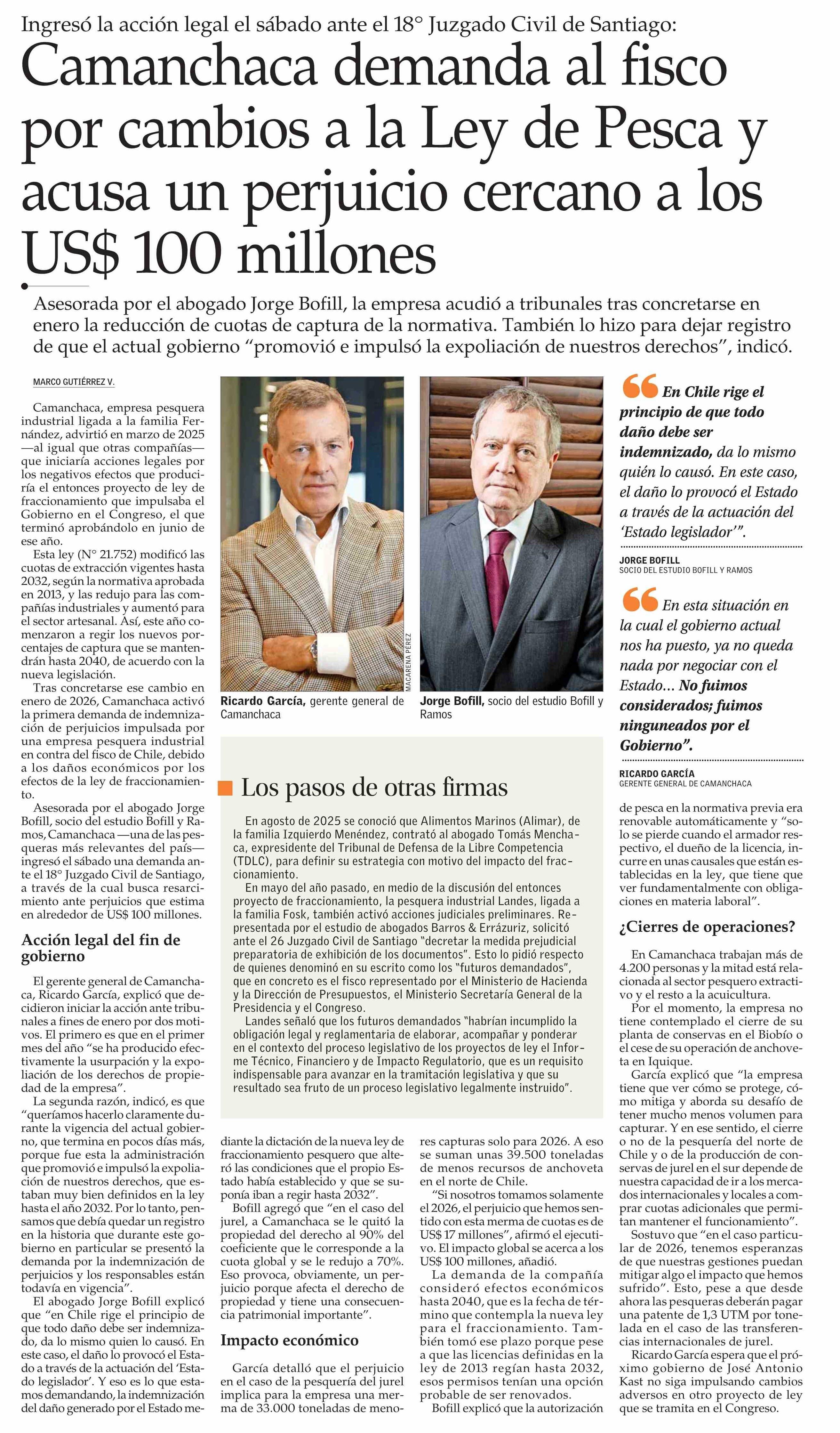 Camanchaca demanda al fisco por cambios a la Ley de Pesca y acusa un perjuicio cercano a los US$ 100 millones