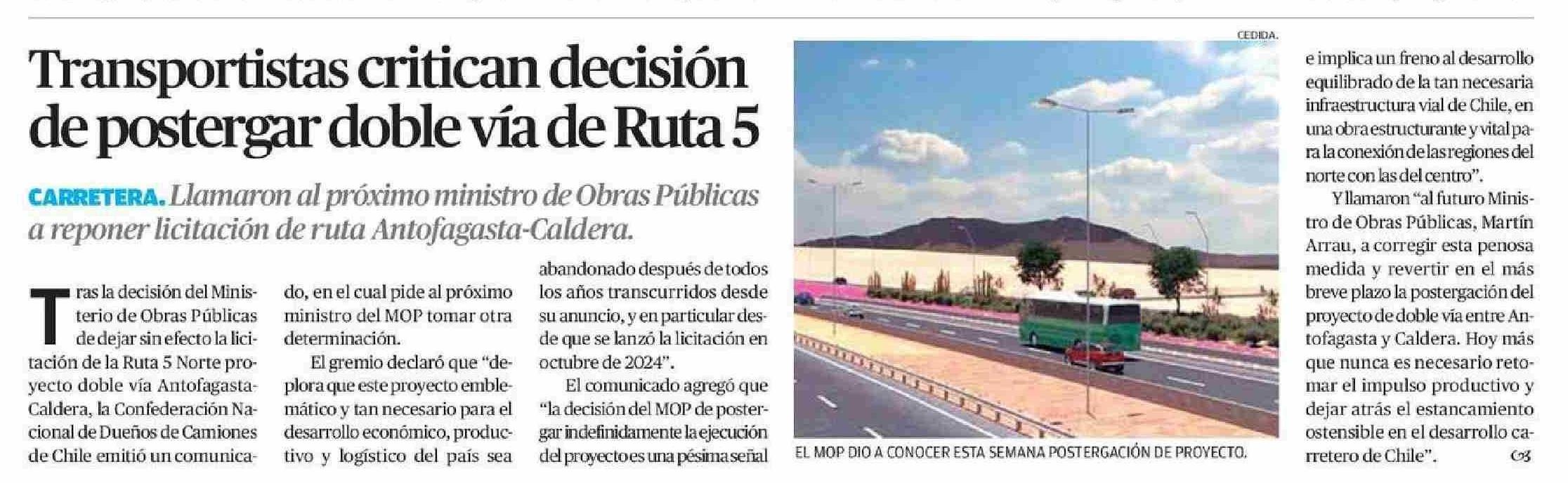 Transportistas critican decisión de postergar doble vía de Ruta 5