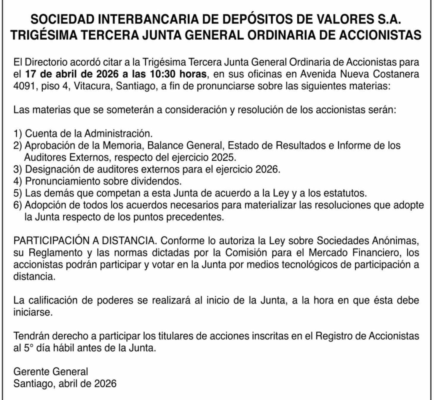 SOCIEDAD INTERBANCARIA DE DEPÓSITOS DE VALORES S.A. TRIGÉSIMA TERCERA JUNTA GENERAL ORDINARIA DE ACCIONISTAS