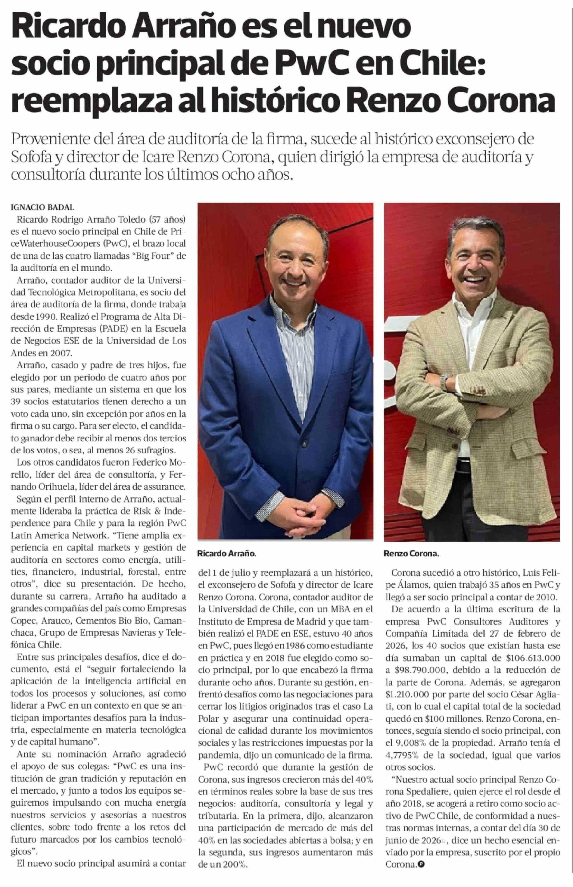 Ricardo Arraño es el nuevo socio principal de PwC en Chile: reemplaza al histórico Renzo Corona