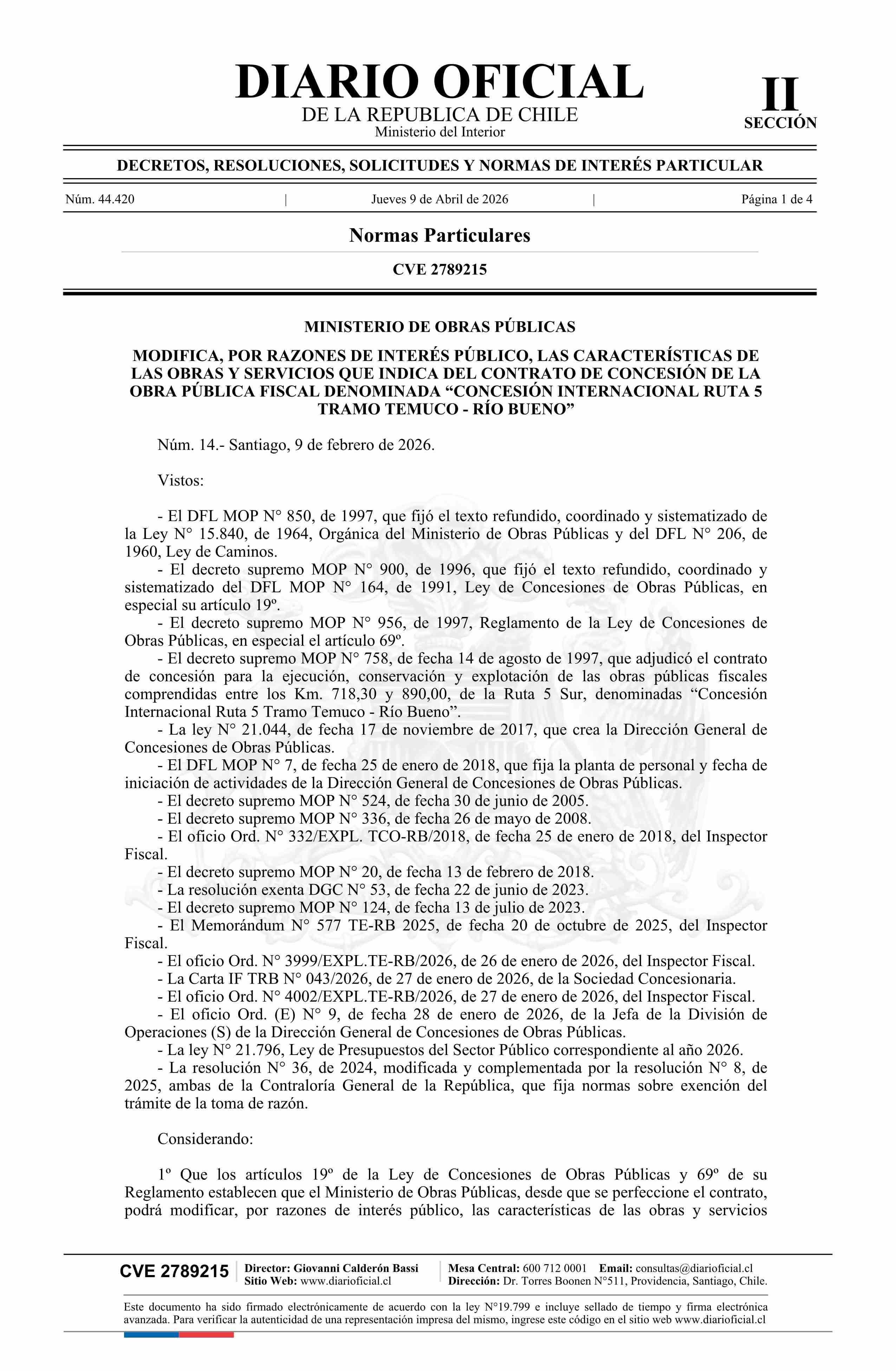 | Título: | Decreto número 14, de 2026.- Modifica, por razones de interés público, las características de las obras y servicios que indica del contrato de concesión de la obra pública fiscal denominada Concesión Internacional Ruta 5 Tramo Temuco - Río Bueno |