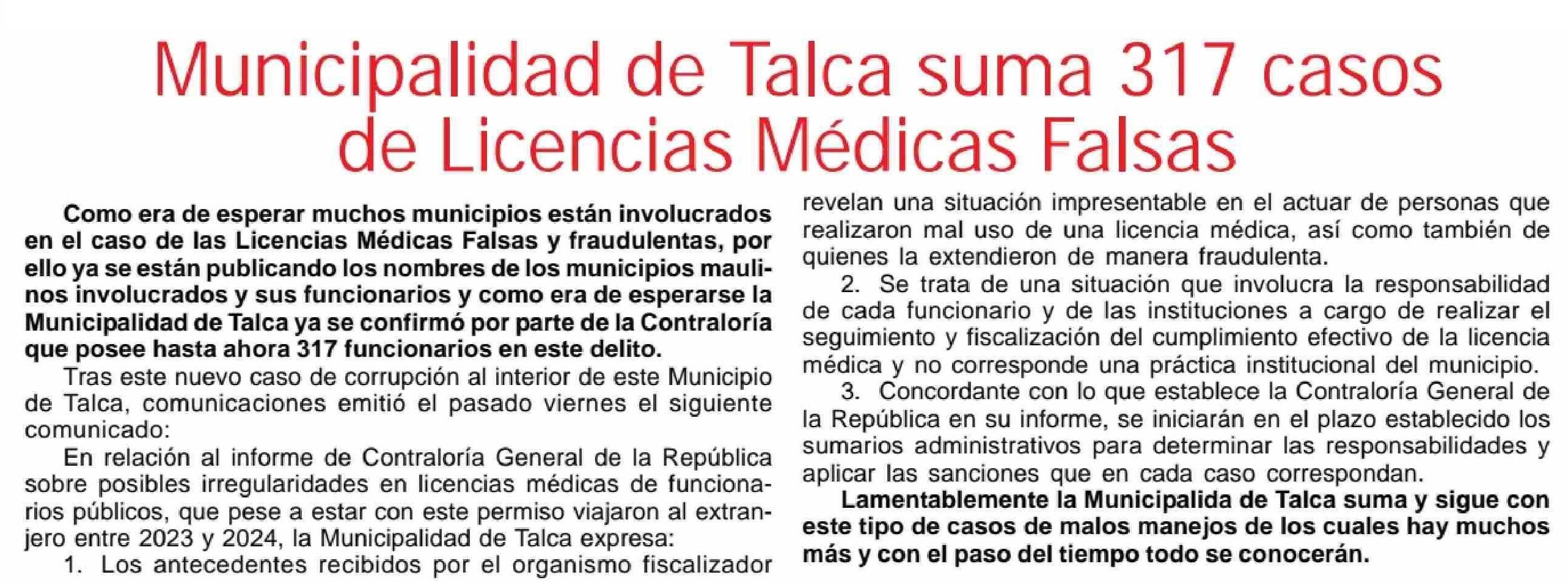 Municipalidad de Talca suma 317 de Licencias Médicas Falsas
