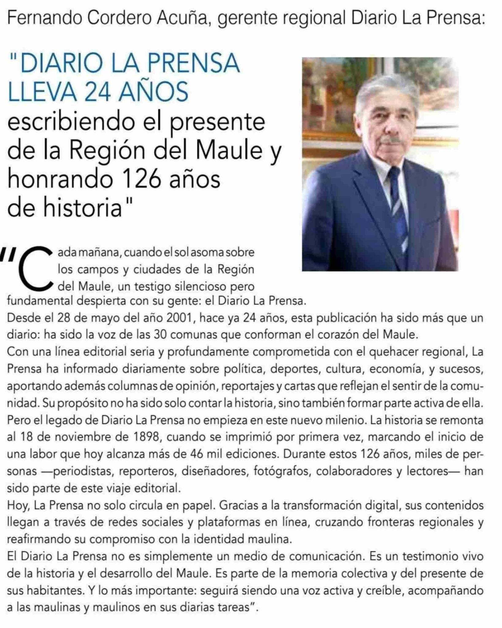 "DIARIO LA PRENSA LLEVA 24 AÑOS escribiendo el presente de la Región del Maule y honrando 126 años de historia"