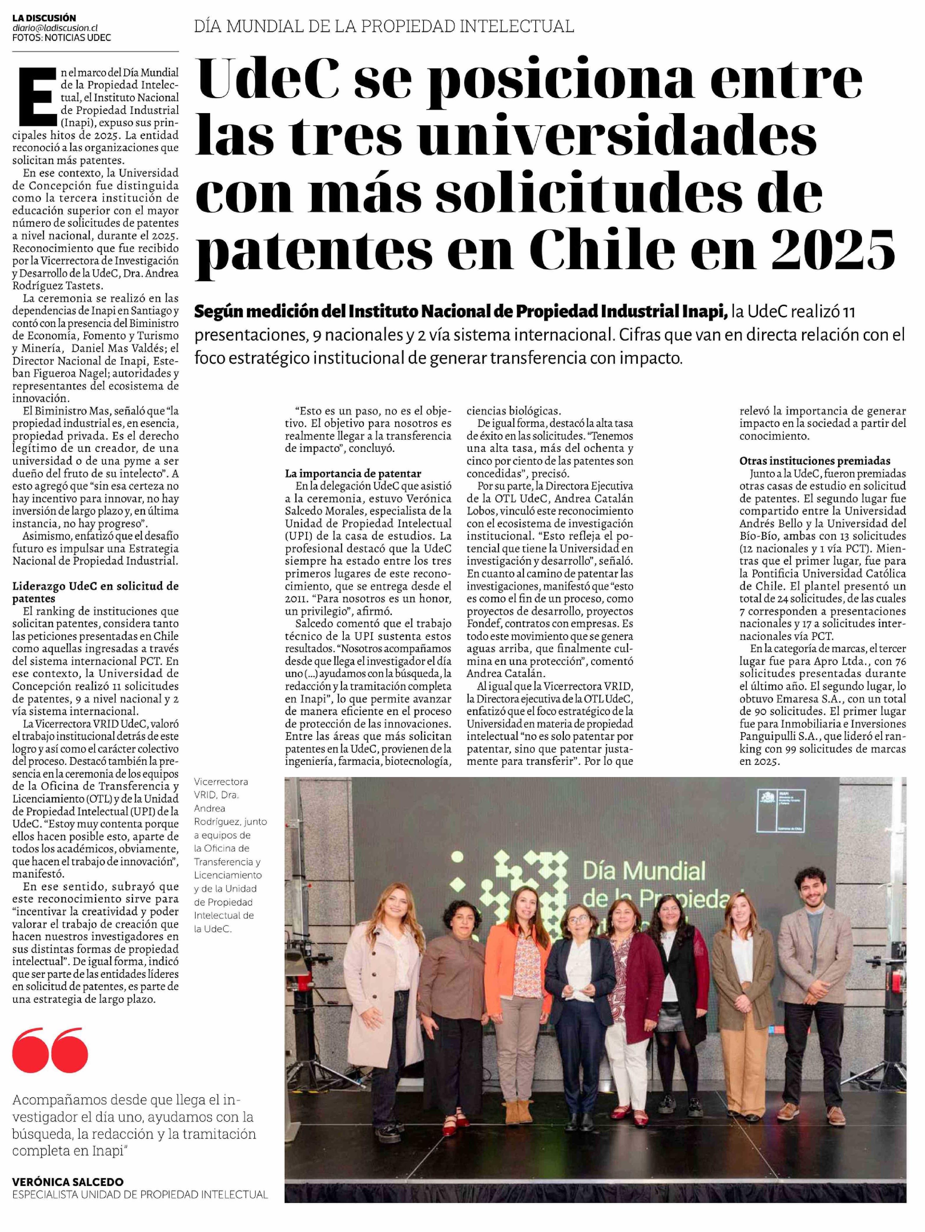 UdeC se posiciona entre las tres universidades con más solicitudes de patentes en Chile en 2025