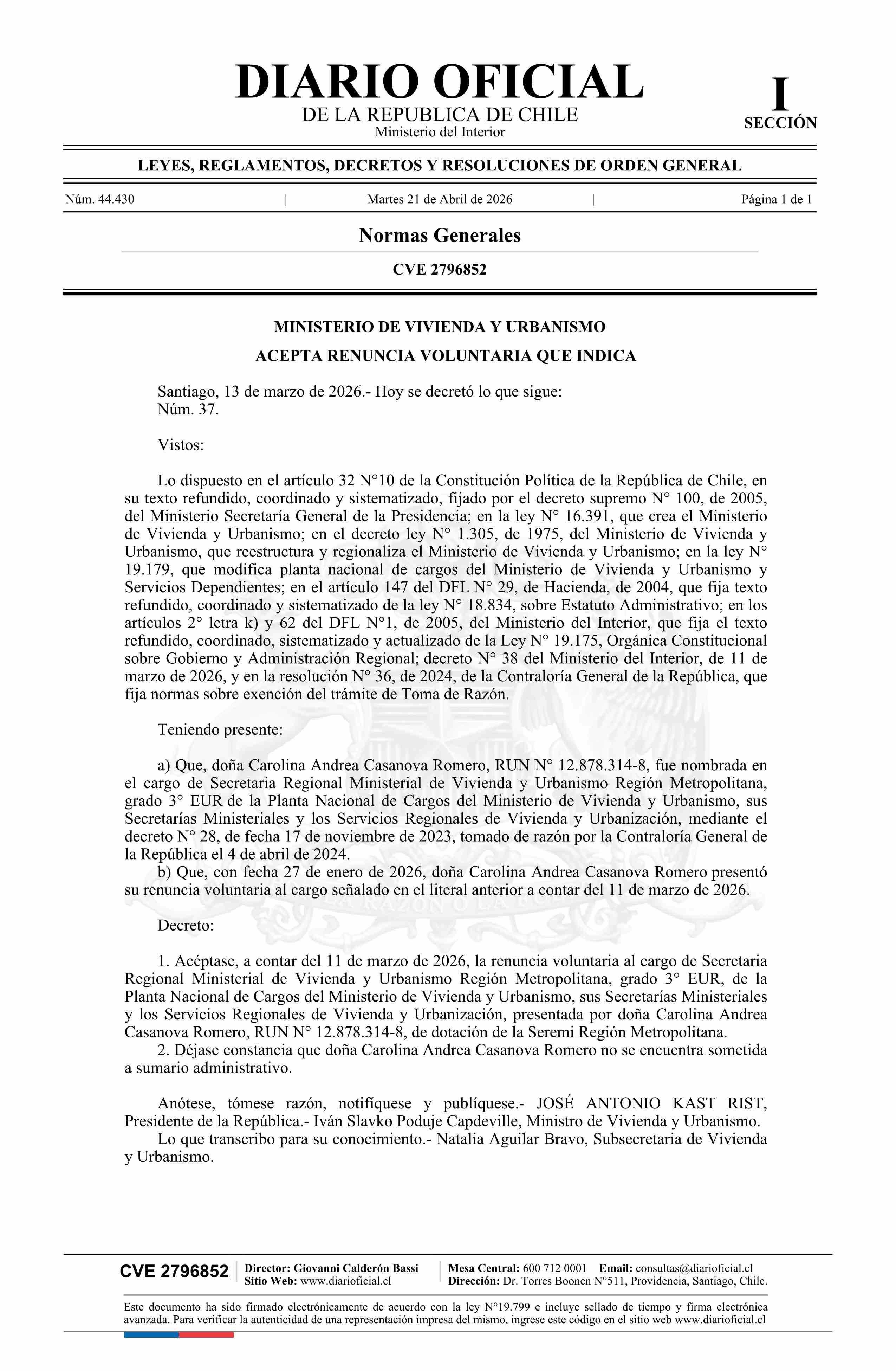 | Título: | Decreto número 37, de 2026.- Acepta renuncia voluntaria de doña Carolina Andrea Casanova Romero al cargo de Secretaria Regional Ministerial de Vivienda y Urbanismo Región Metropolitana |