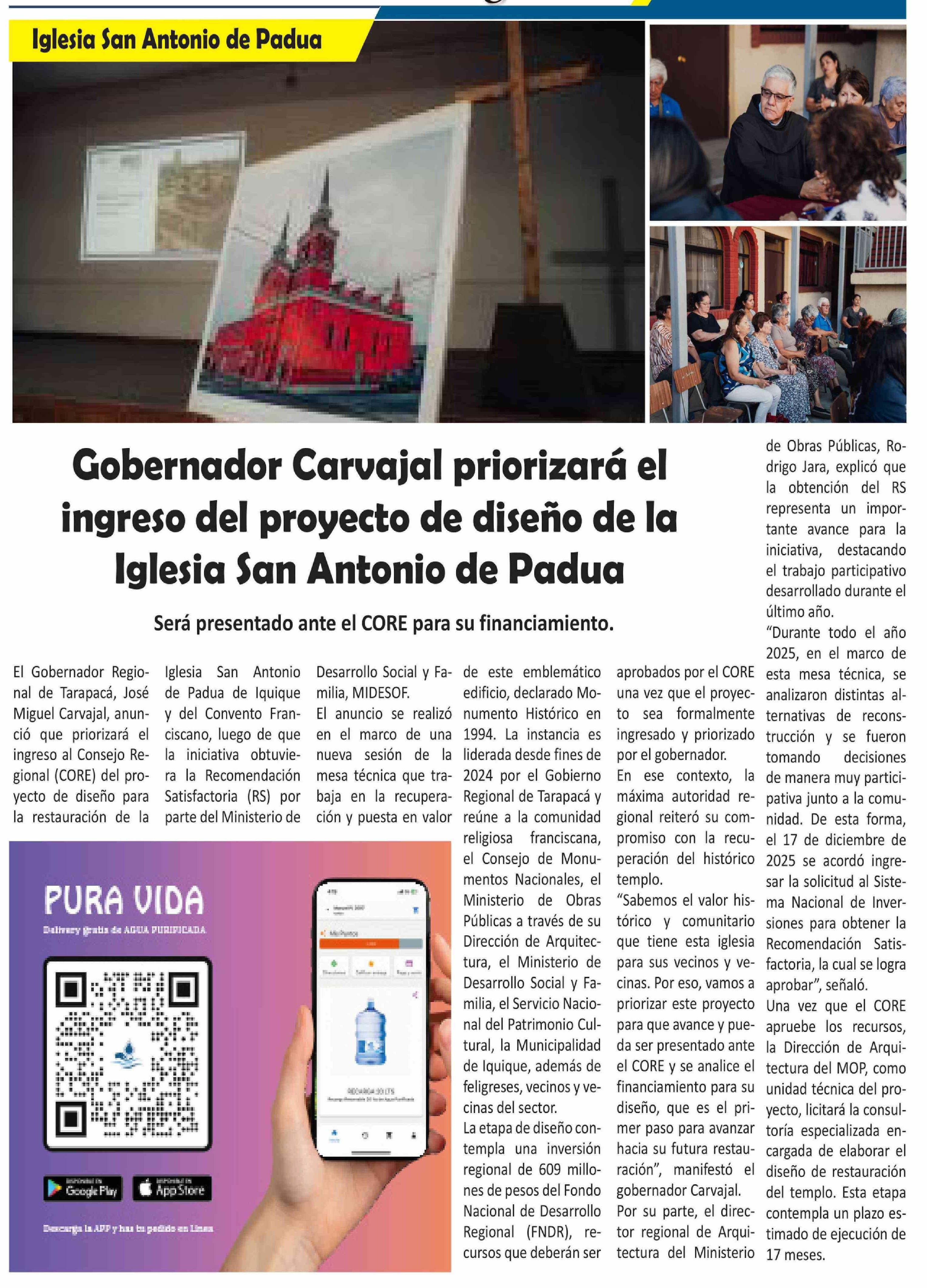Gobernador Carvajal priorizará el ingreso del proyecto de diseño de la Iglesia San Antonio de Padua