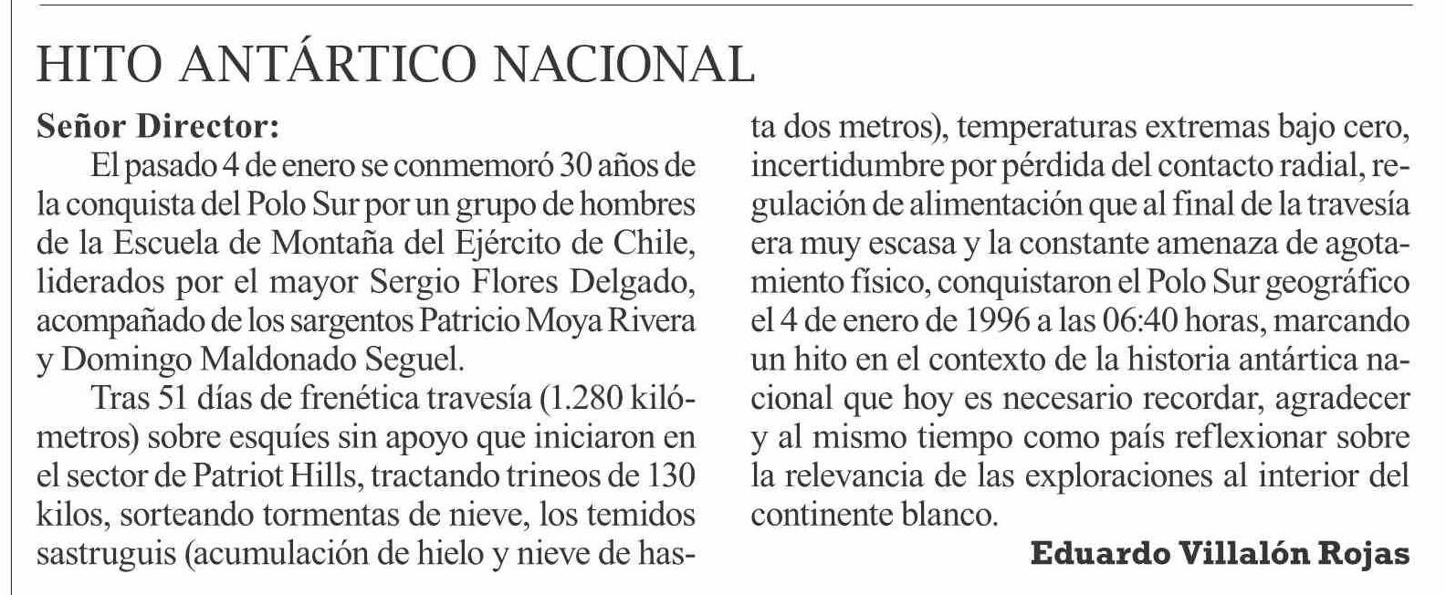 Título: Cartas: Señor Director: El pasado 4 de enero se conmemoró 30 años de la conquista del Polo Sur por un grupo de hombres de la Escuela de Montaña del Ejército de Chile, liderados por el mayor Sergio Flores Delgado, acompañado de los sargentos Patricio Moya Rivera y Domingo Maldonado Seguel. Tras 51 dí
