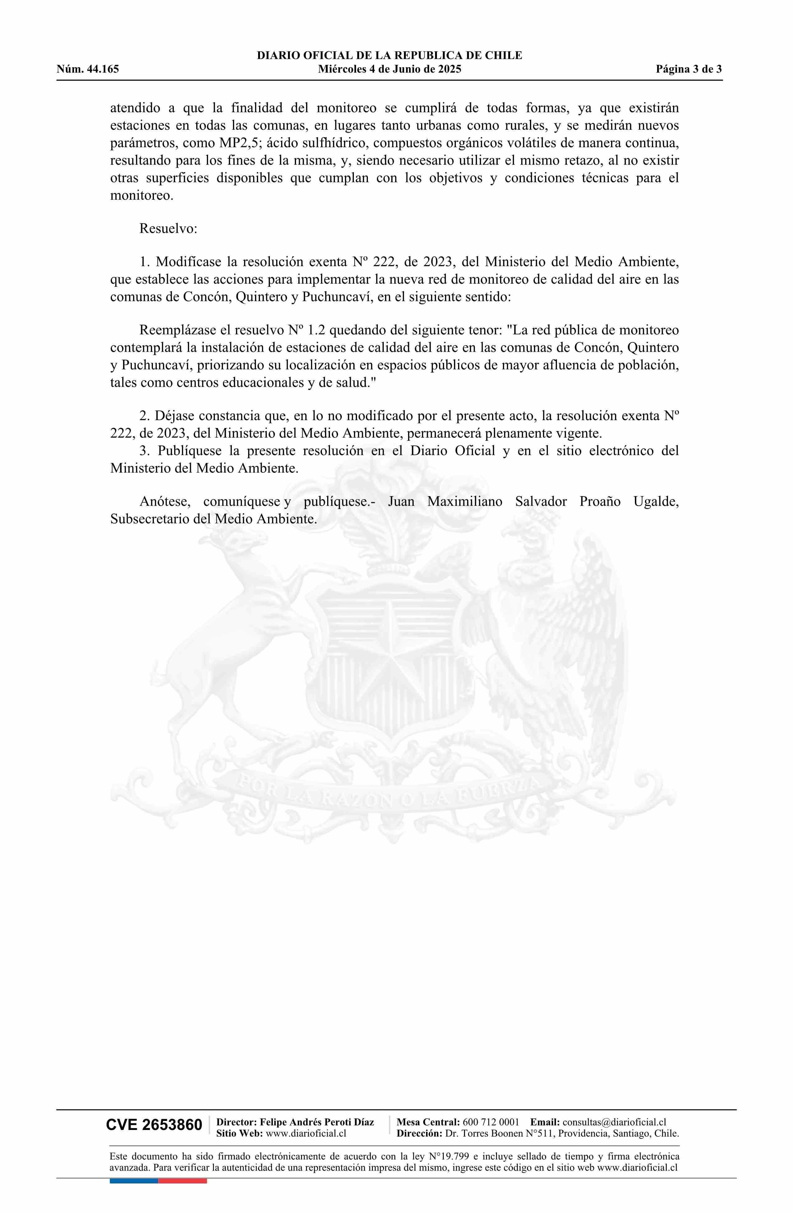 | Título: | Resolución exenta número 2.607, de 2025.- Modifica resolución Nº 222 exenta, de 2023, que establece las acciones para implementar la nueva red de monitoreo de calidad del aire en las comunas de Concón, Quintero y Puchuncaví |