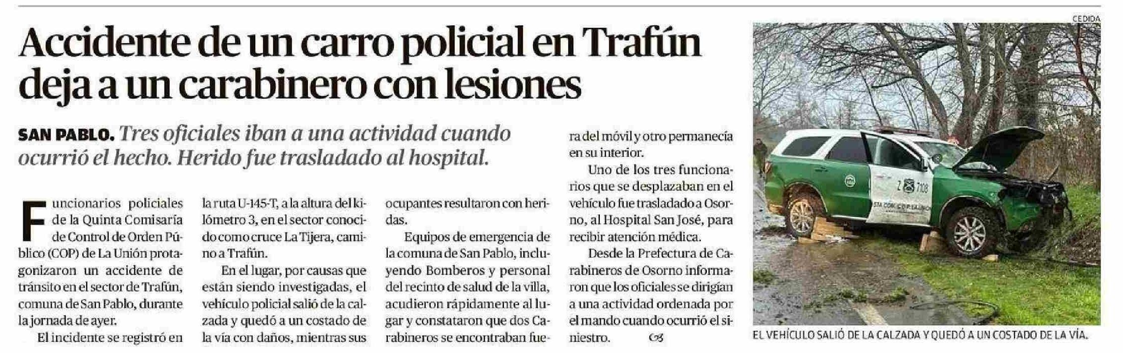Accidente de un carro policial en Trafún deja a un carabinero con lesiones