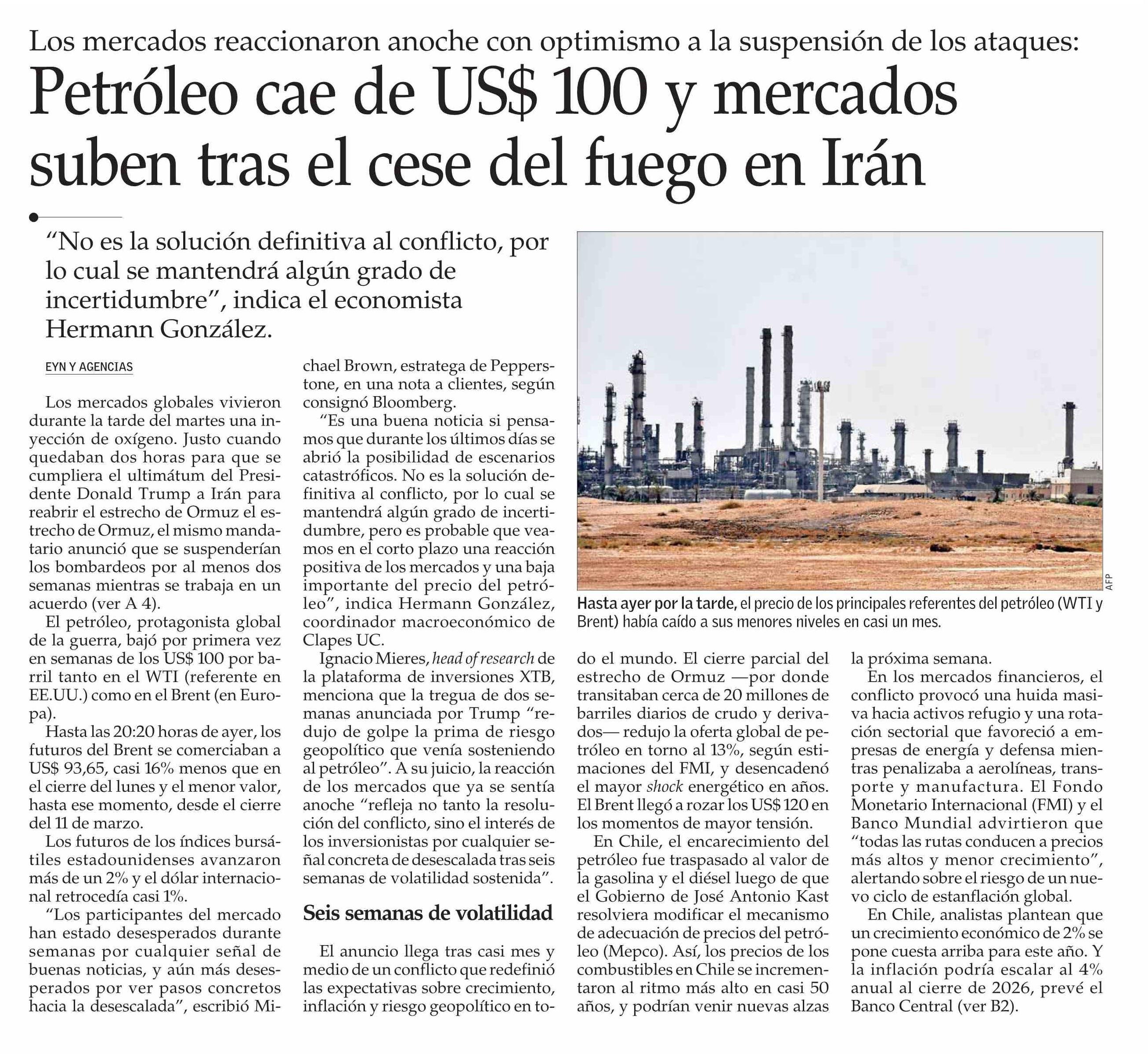 Petróleo cae de US$ 100 y mercados suben tras el cese del fuego en Irán