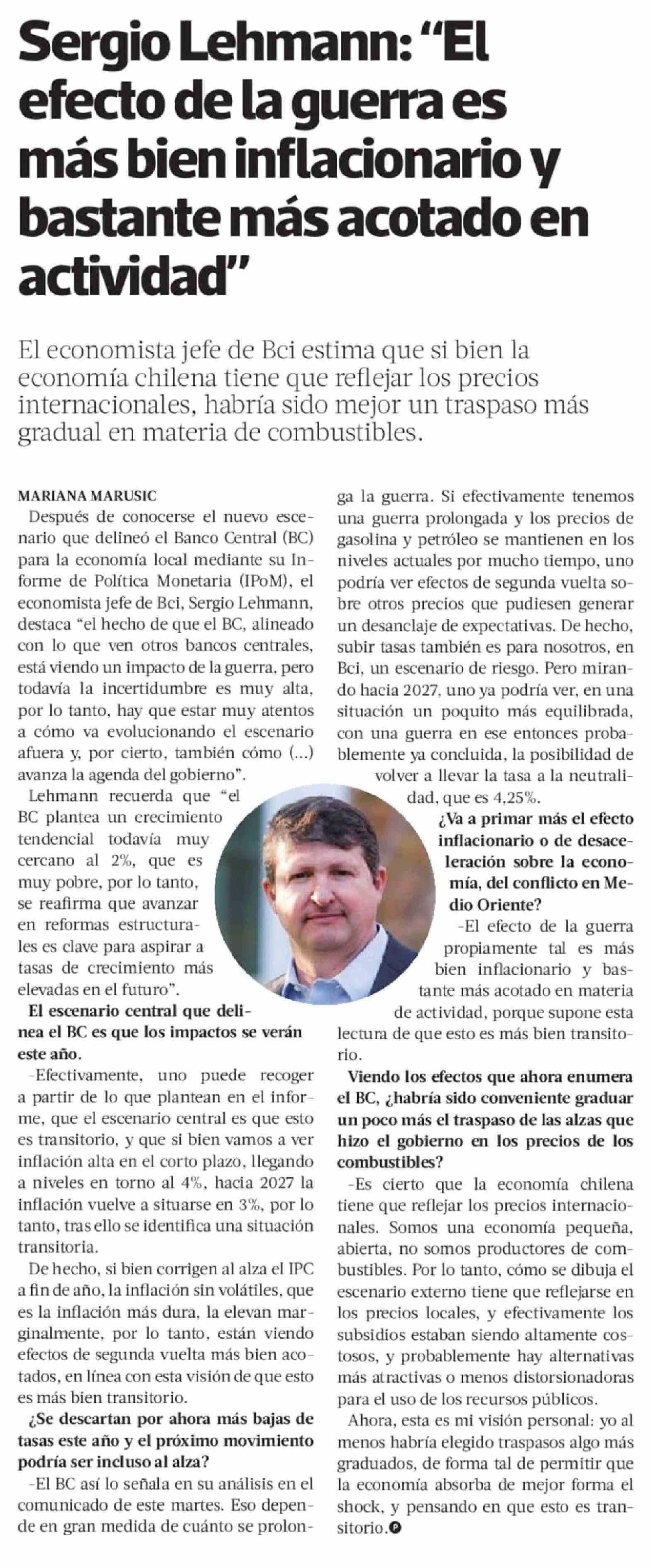Sergio Lehmann: "El efecto de la guerra es más bien inflacionario y bastante más acotado en actividad"