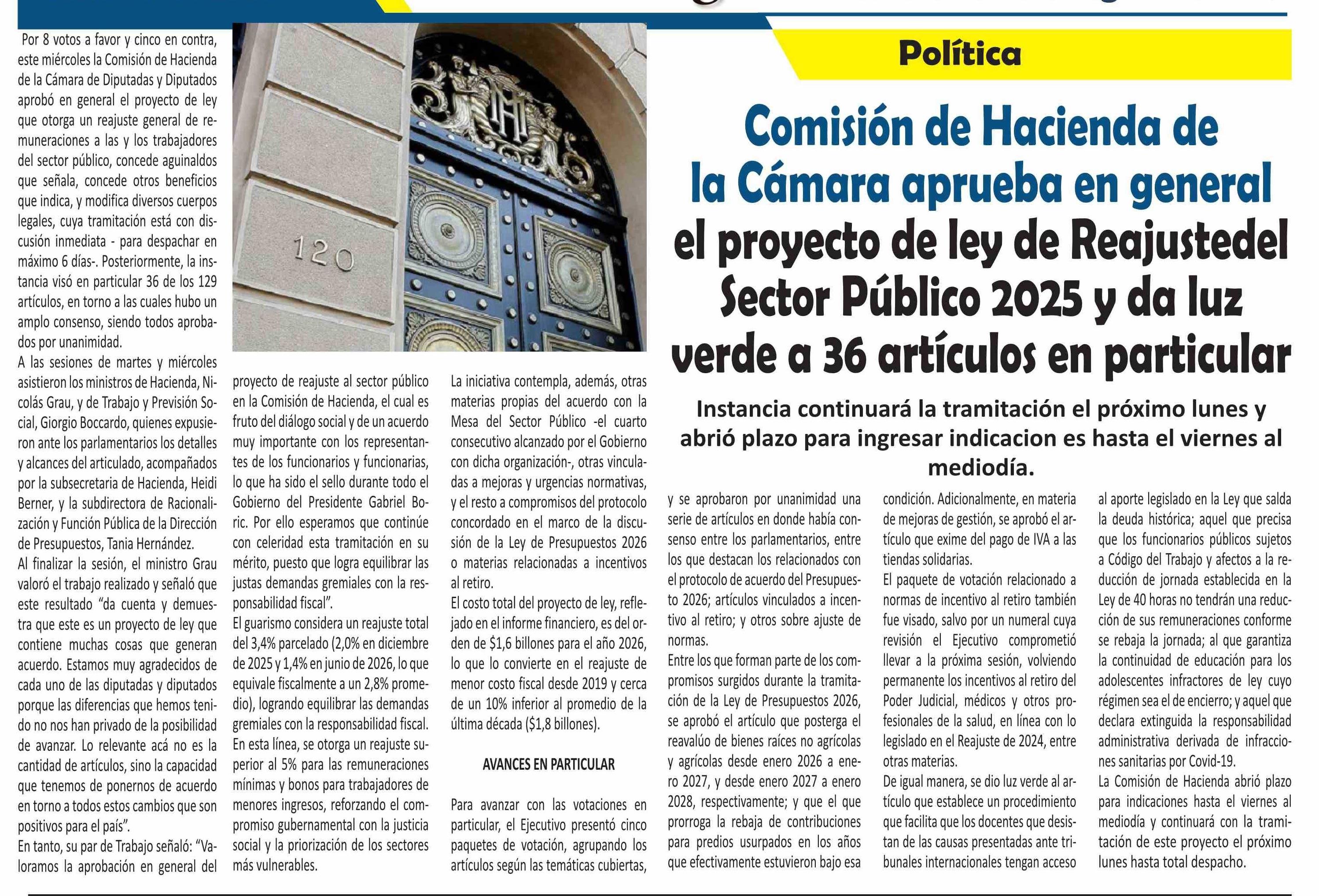Comisión de Hacienda de la Cámara aprueba en general el proyecto de ley de Reajustedel Sector Público 2025 y da luz verde a 36 artículos en particular