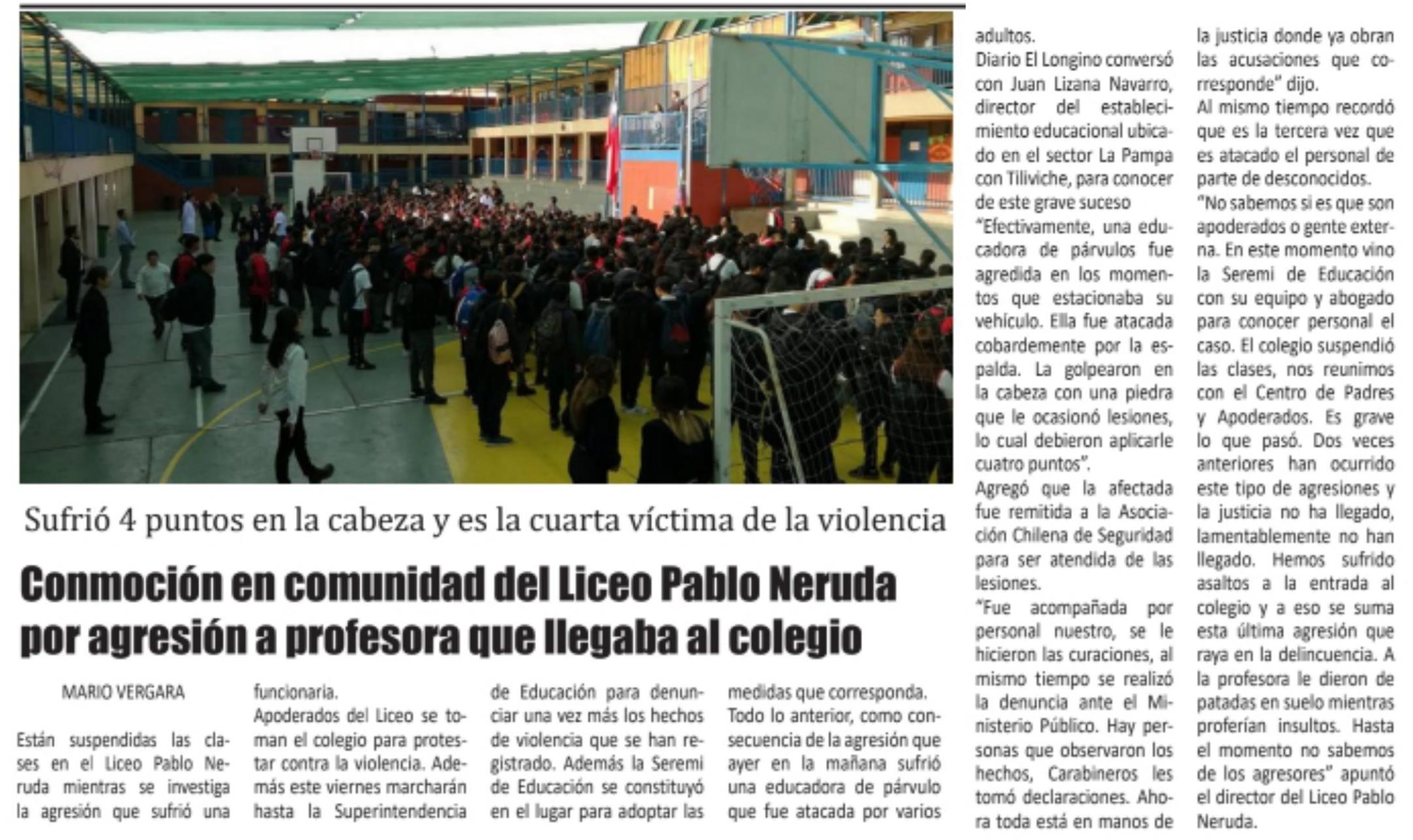 Conmoción en comunidad del Liceo Pablo Neruda por agresión a profesora que llegaba al colegio