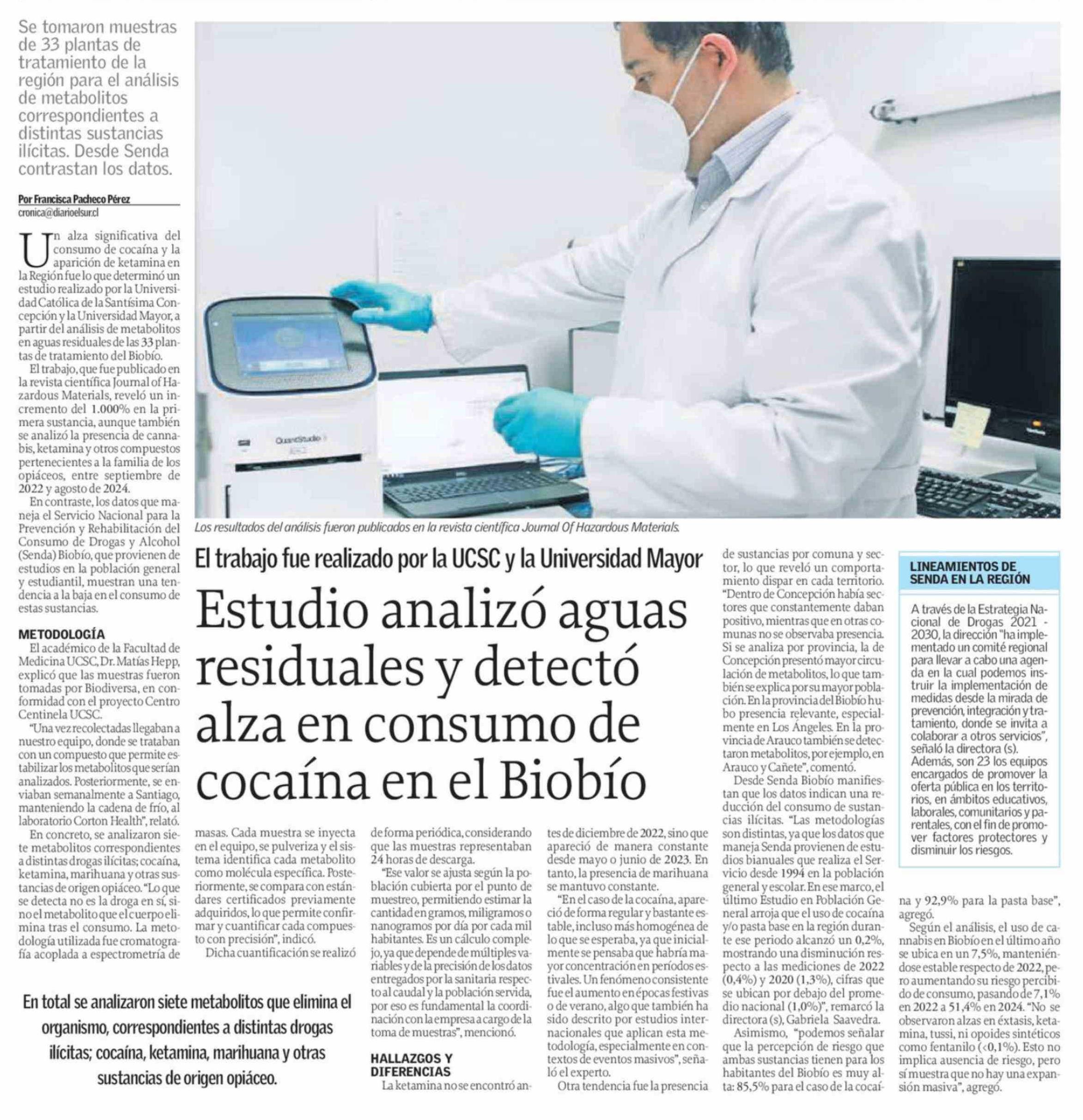 Estudio analizó aguas residuales y detectó alza en consumo de cocaína en el Biobío