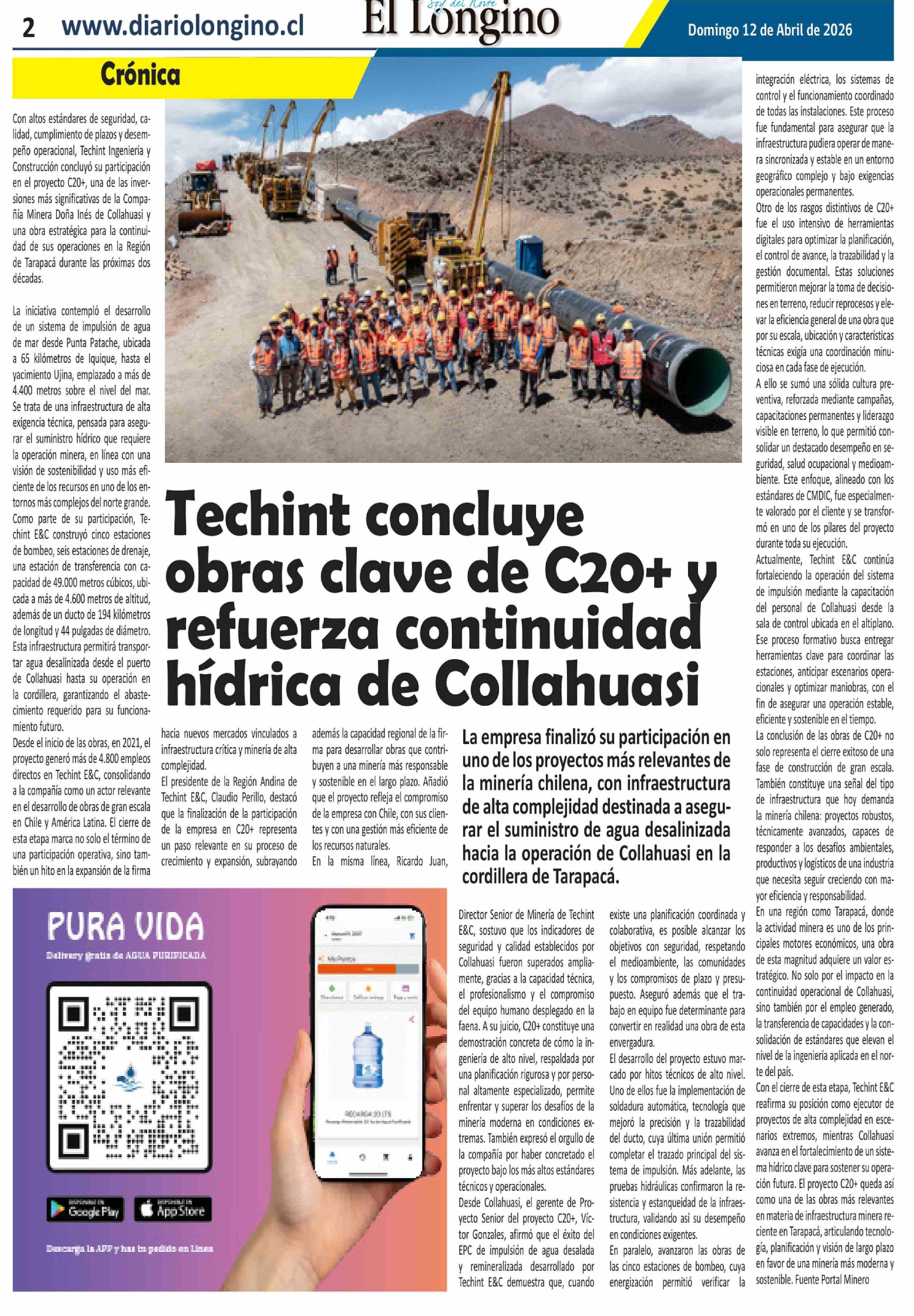 Techint concluye obras clave de C20+ y refuerza continuidad hídrica de Collahuasi