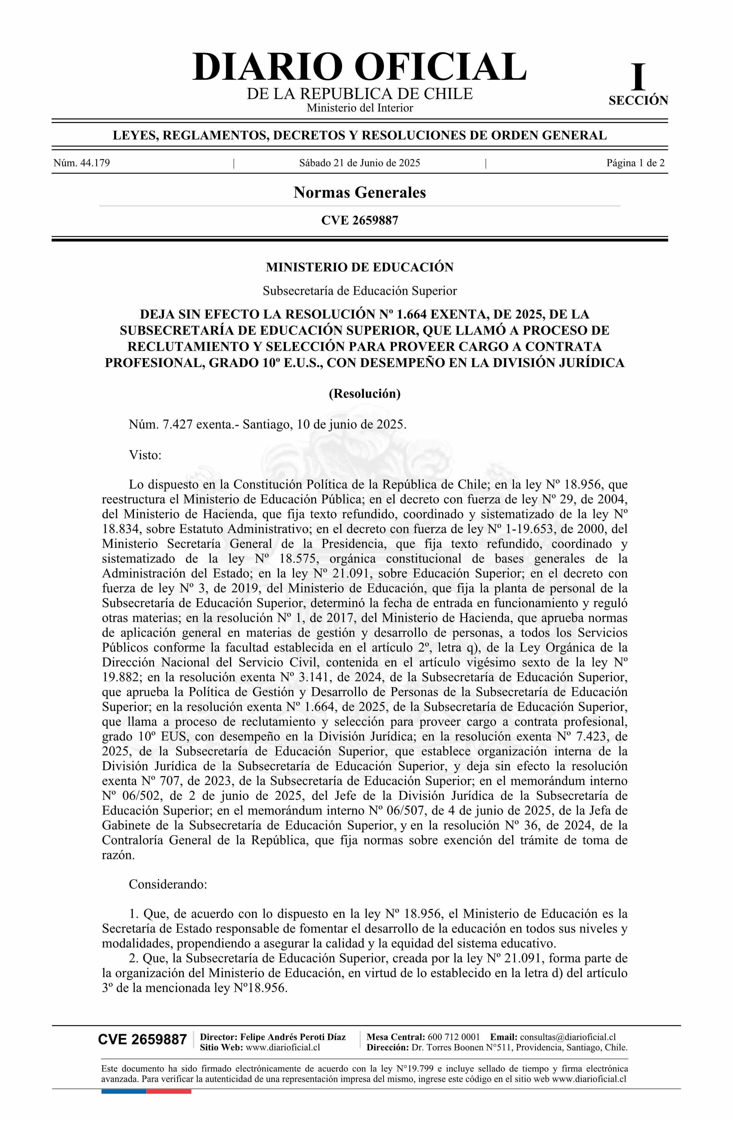 | Título: | Resolución exenta número 7.427, de 2025.- Deja sin efecto resolución Nº 1.664 exenta, de 2025, que llamó a proceso de reclutamiento y selección para proveer cargo a contrata profesional, grado 10º EUS, con desempeño en la División Jurídica |