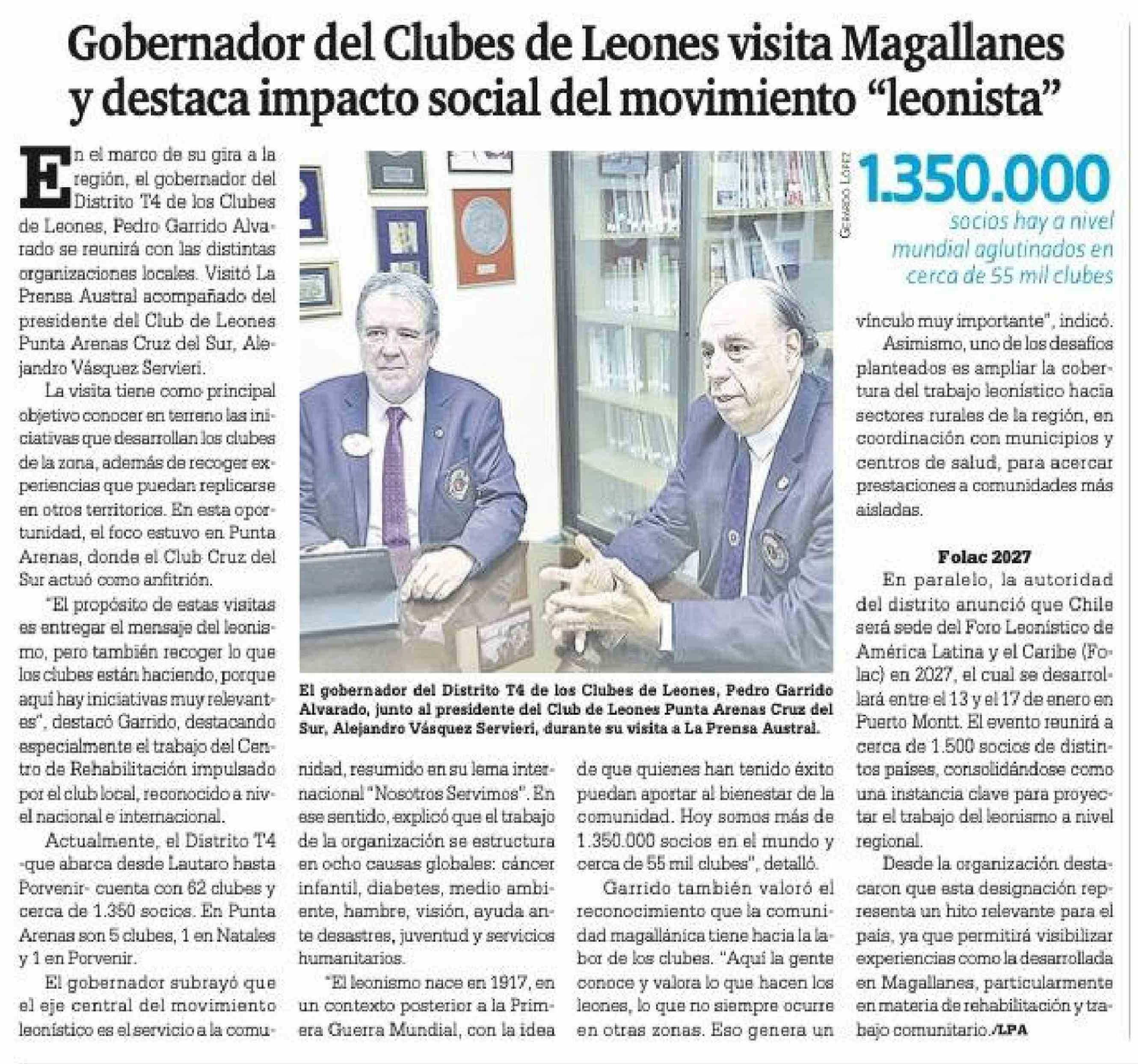 Gobernador del Clubes de Leones visita Magallanes y destaca impacto social del movimiento "leonista"