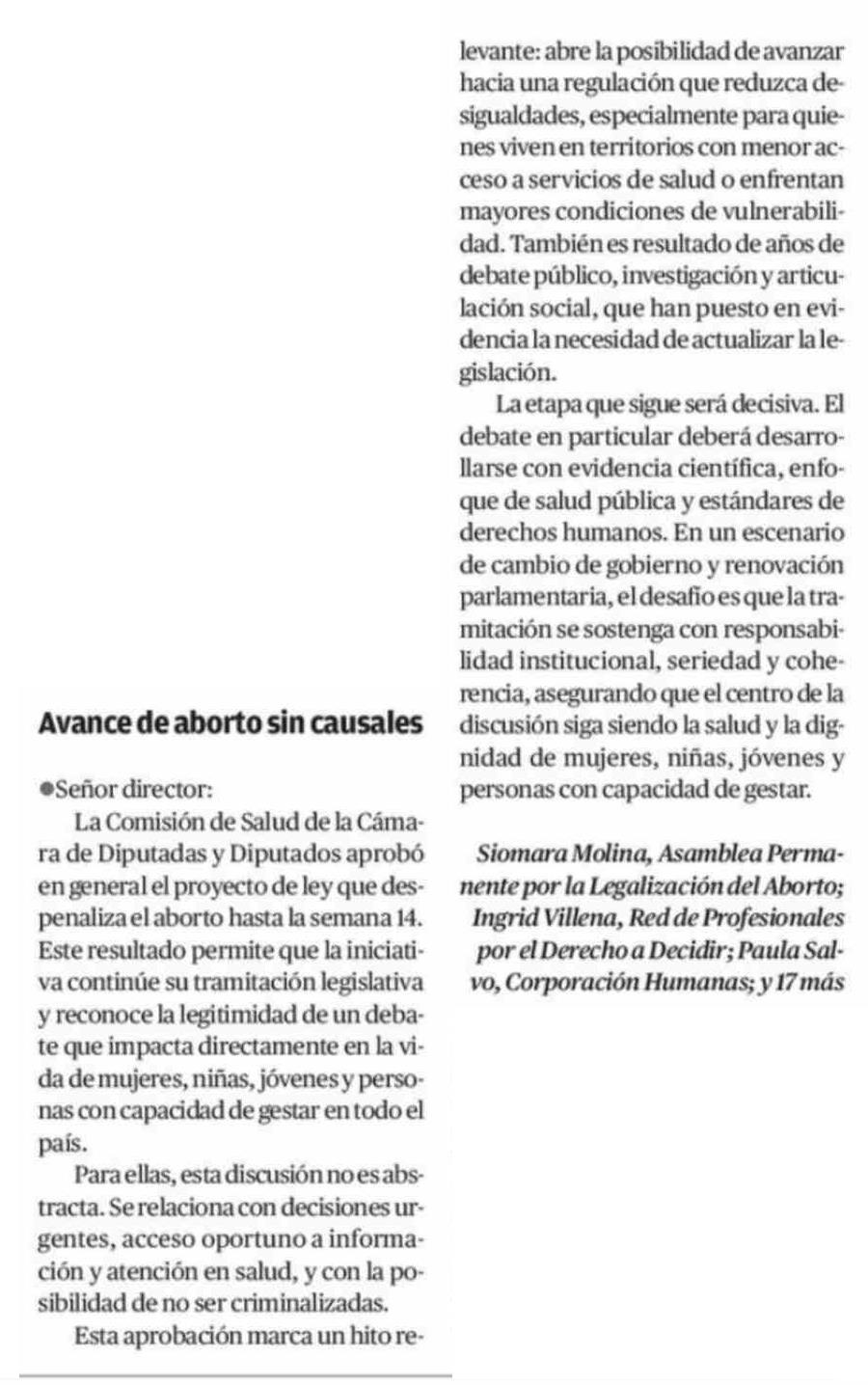 Título: Cartas: Avance de aborto sin causales