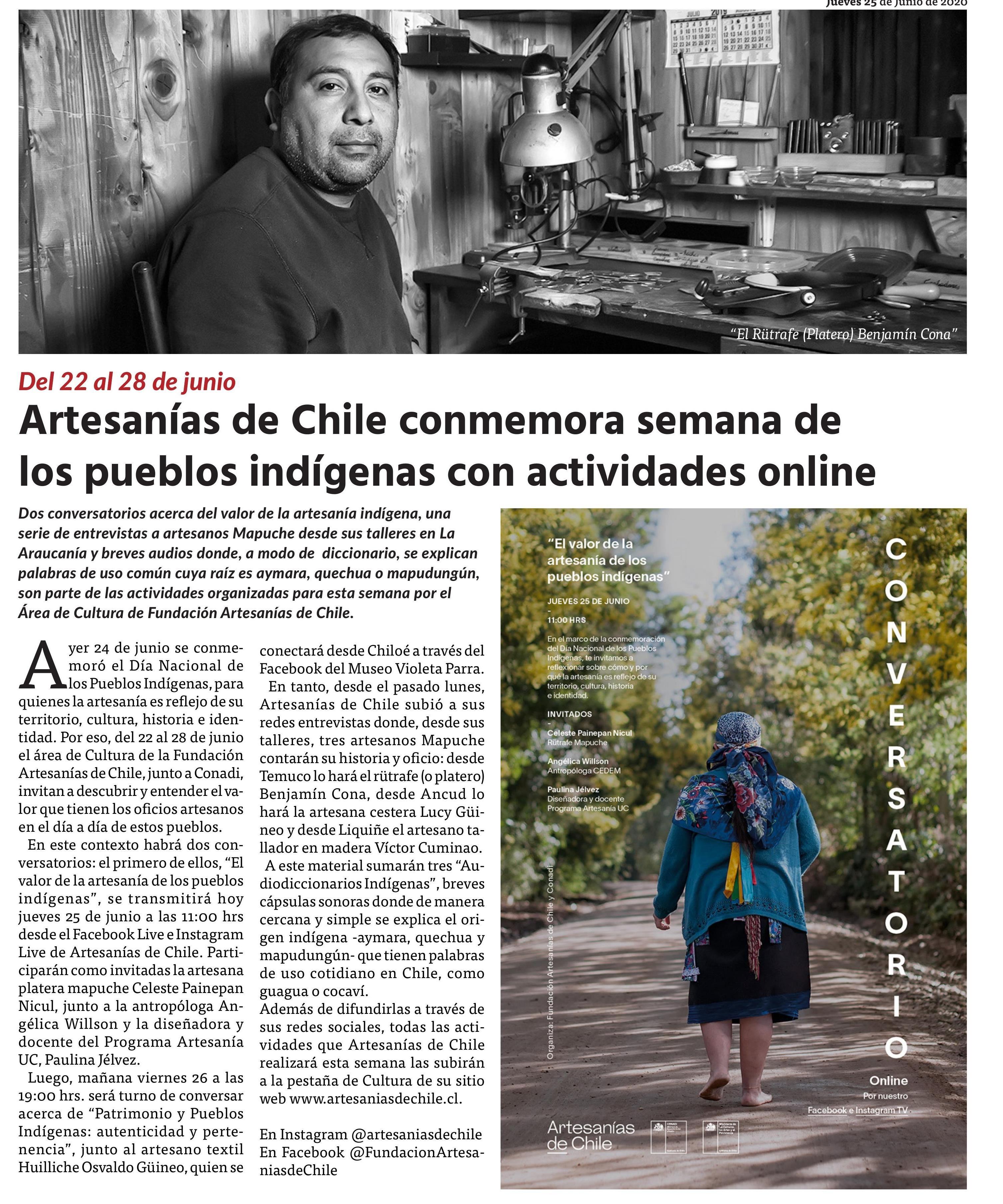 Artesanías de Chile conmemora semana de los pueblos indígenas con actividades online