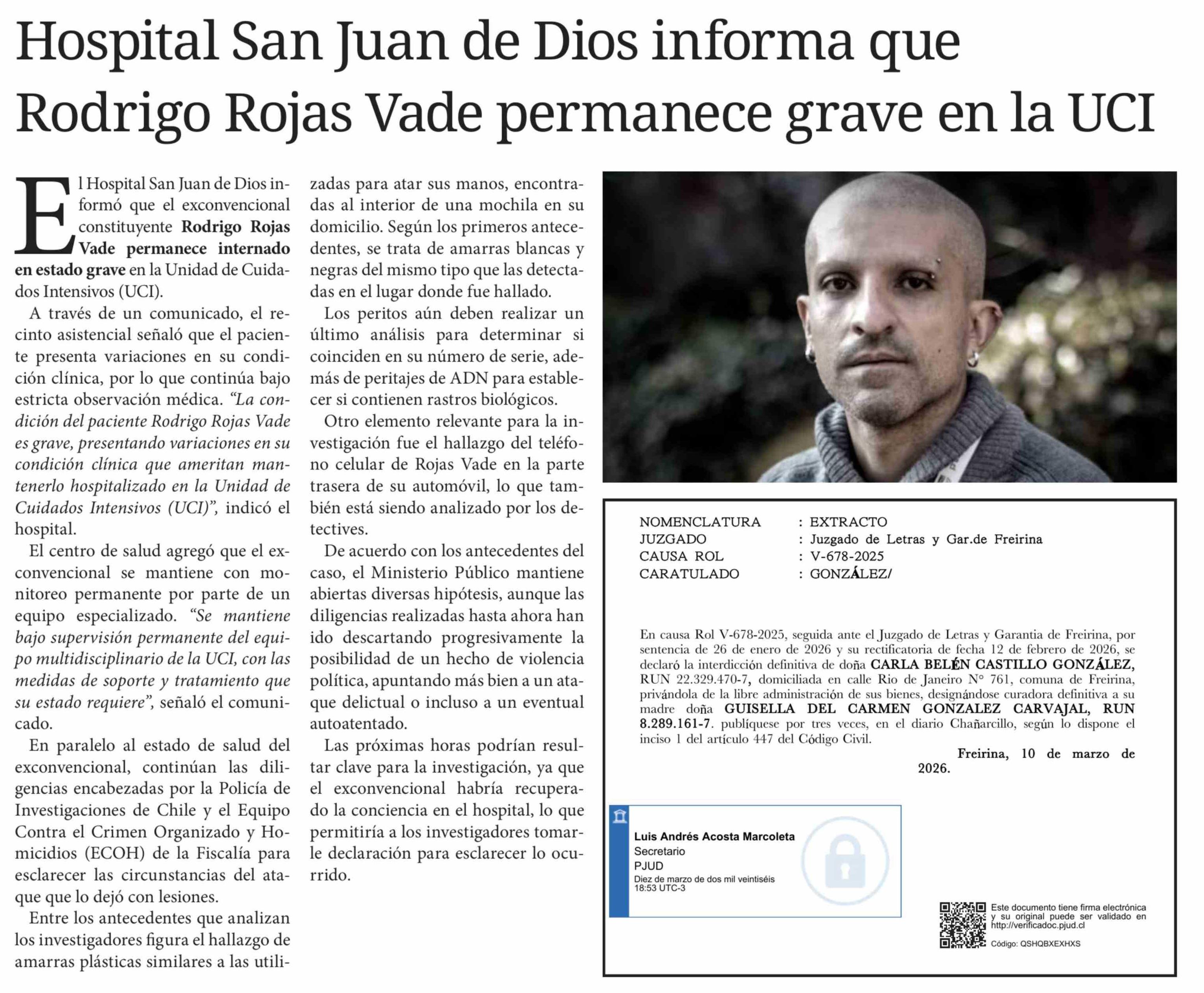 Hospital San Juan de Dios informa que Rodrigo Rojas Vade permanece grave en la UCI