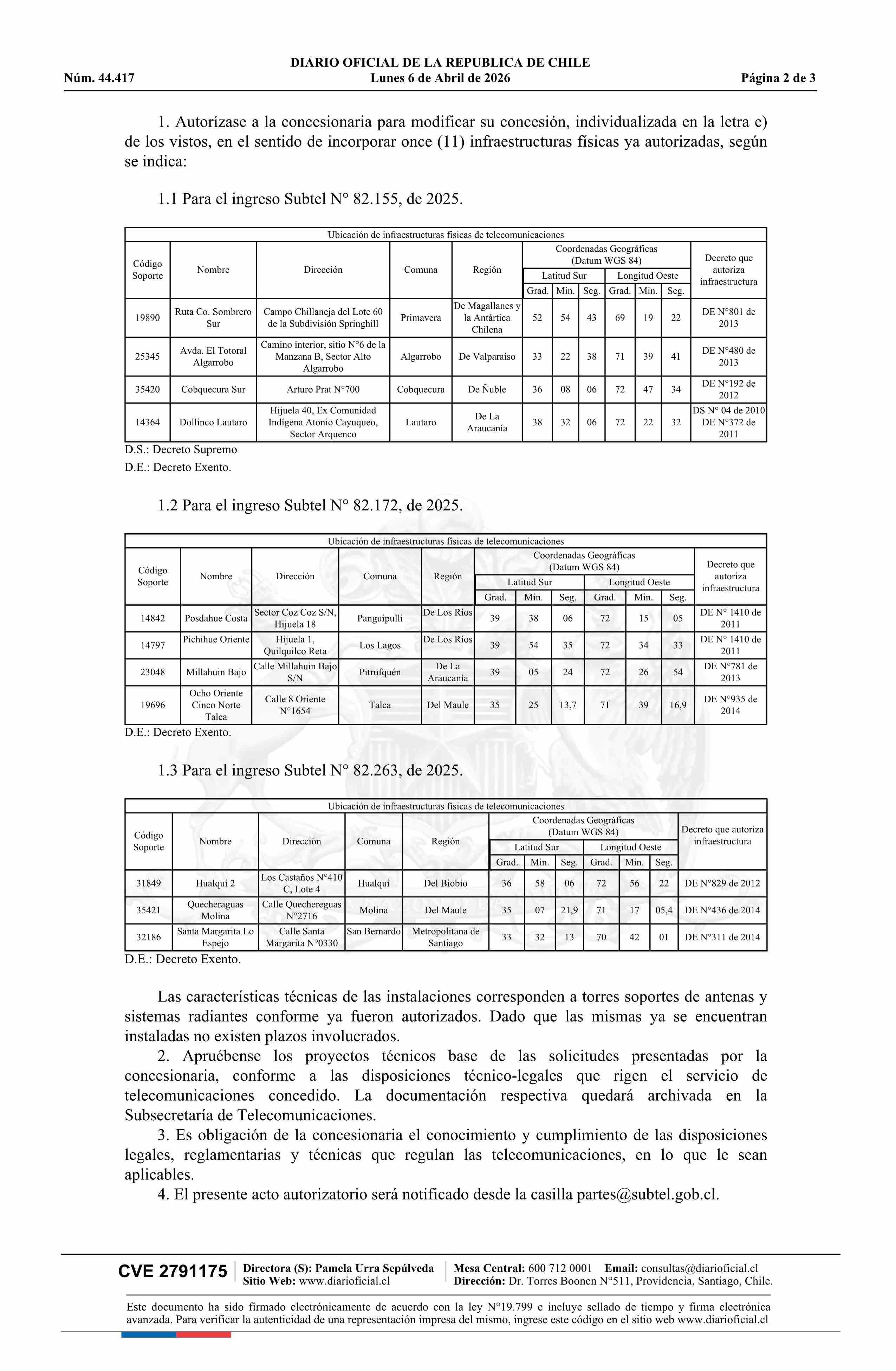 | Título: | Decreto exento número 193, de 2026.- Modifica concesión de servicio intermedio de telecomunicaciones, que únicamente provea infraestructura física para telecomunicaciones, a la empresa ATC Sitios de Chile S.A. |