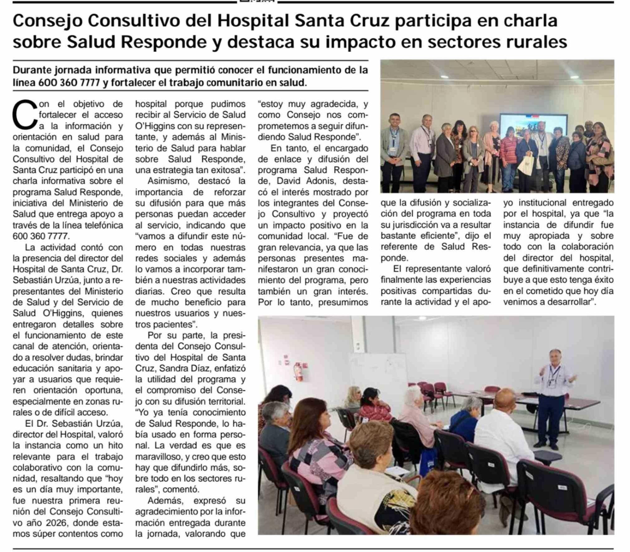 | Título: | Consejo Consultivo del Hospital Santa Cruz participa en charla sobre Salud Responde y destaca su impacto en sectores rurales |