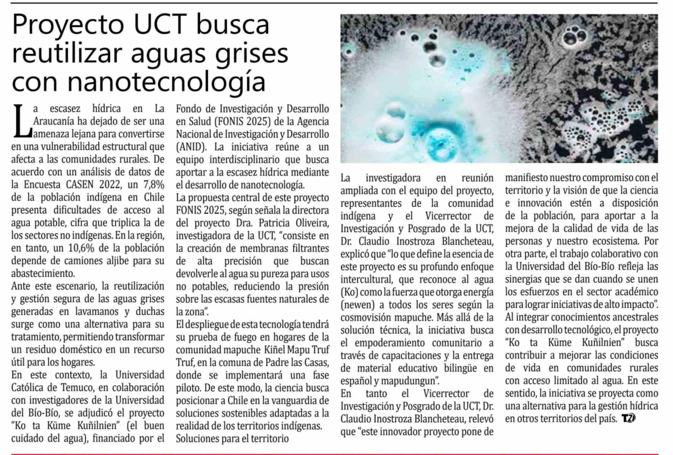 Proyecto UCT busca reutilizar aguas grises con nanotecnología