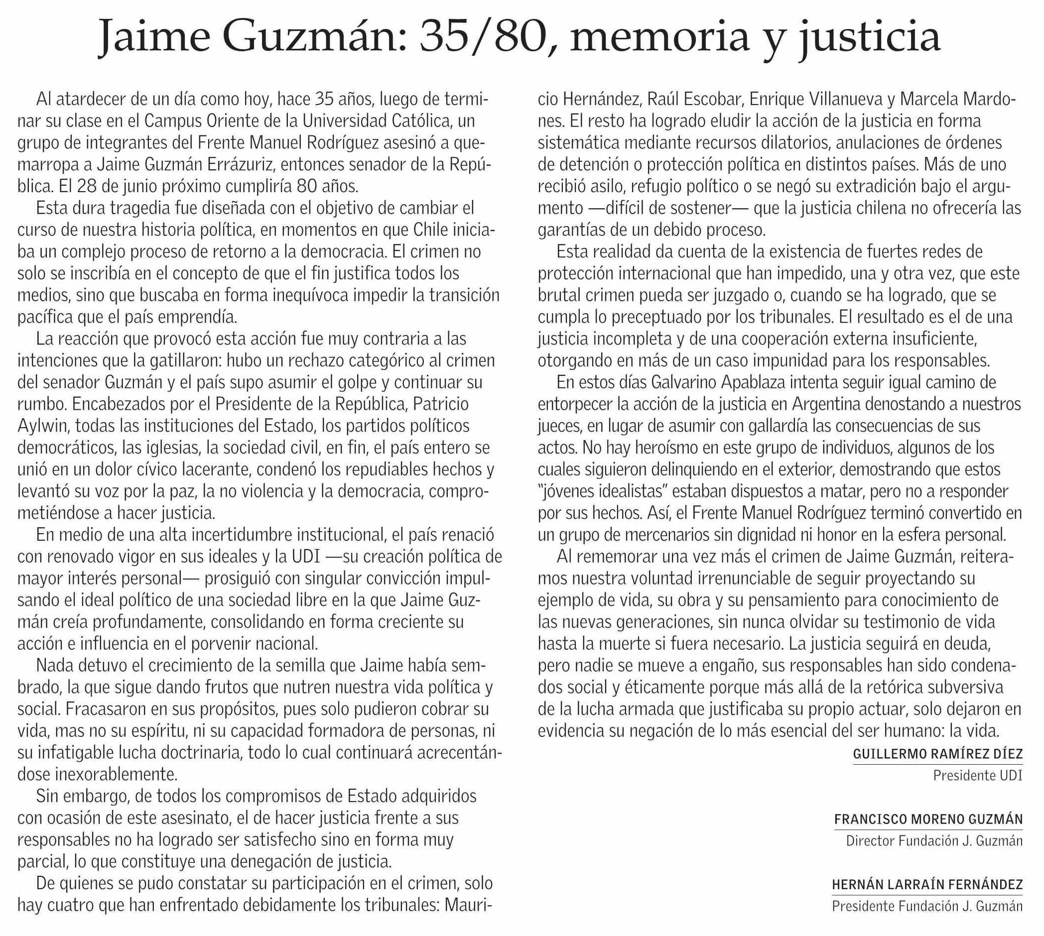 Título: Columnas de Opinión: Jaime Guzmán: 35/80, memoria y justicia