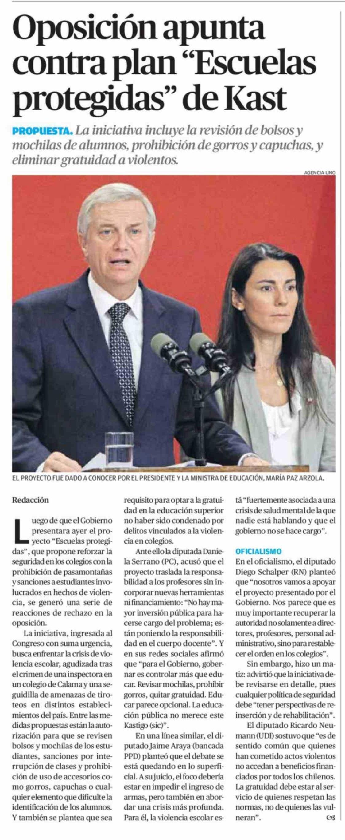 Oposición apunta contra plan "Escuelas protegidas" de Kast