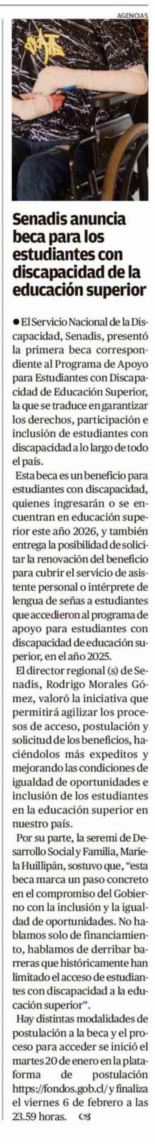 Senadis anuncia beca para los estudiantes con discapacidad de la educación superior