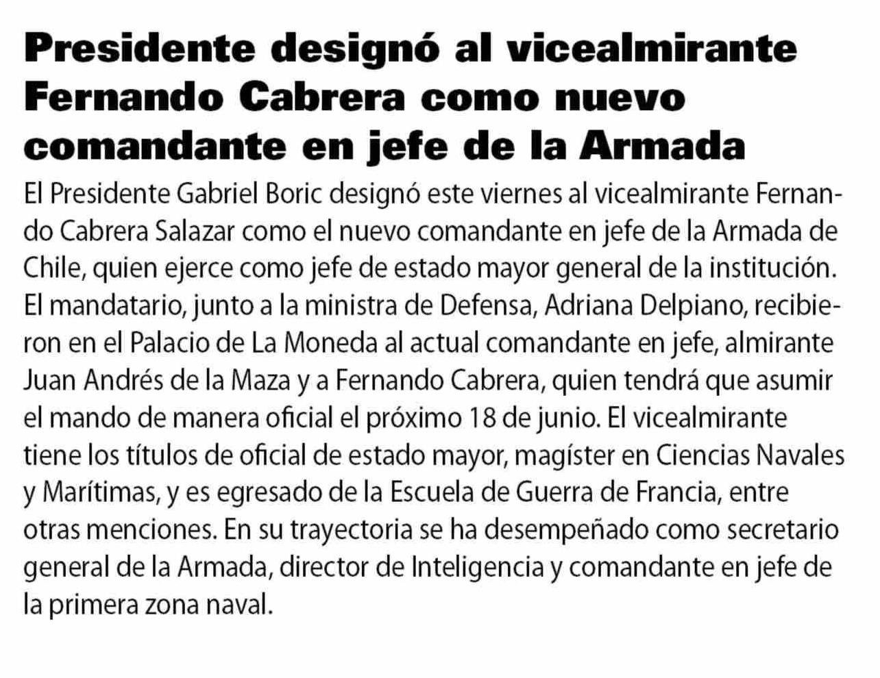 Presidente designó al vicealmirante Fernando Cabrera como nuevo comandante en jefe de la Armada
