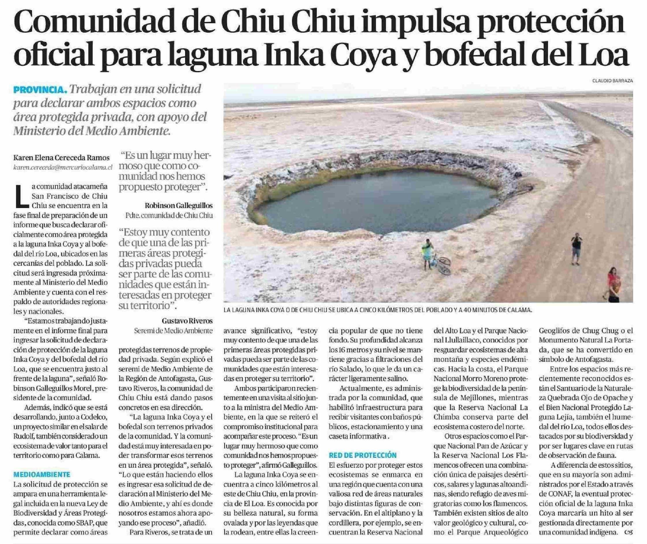 Comunidad de Chiu Chiu impulsa protección oficial para laguna Inka Coya y bofedal del Loa