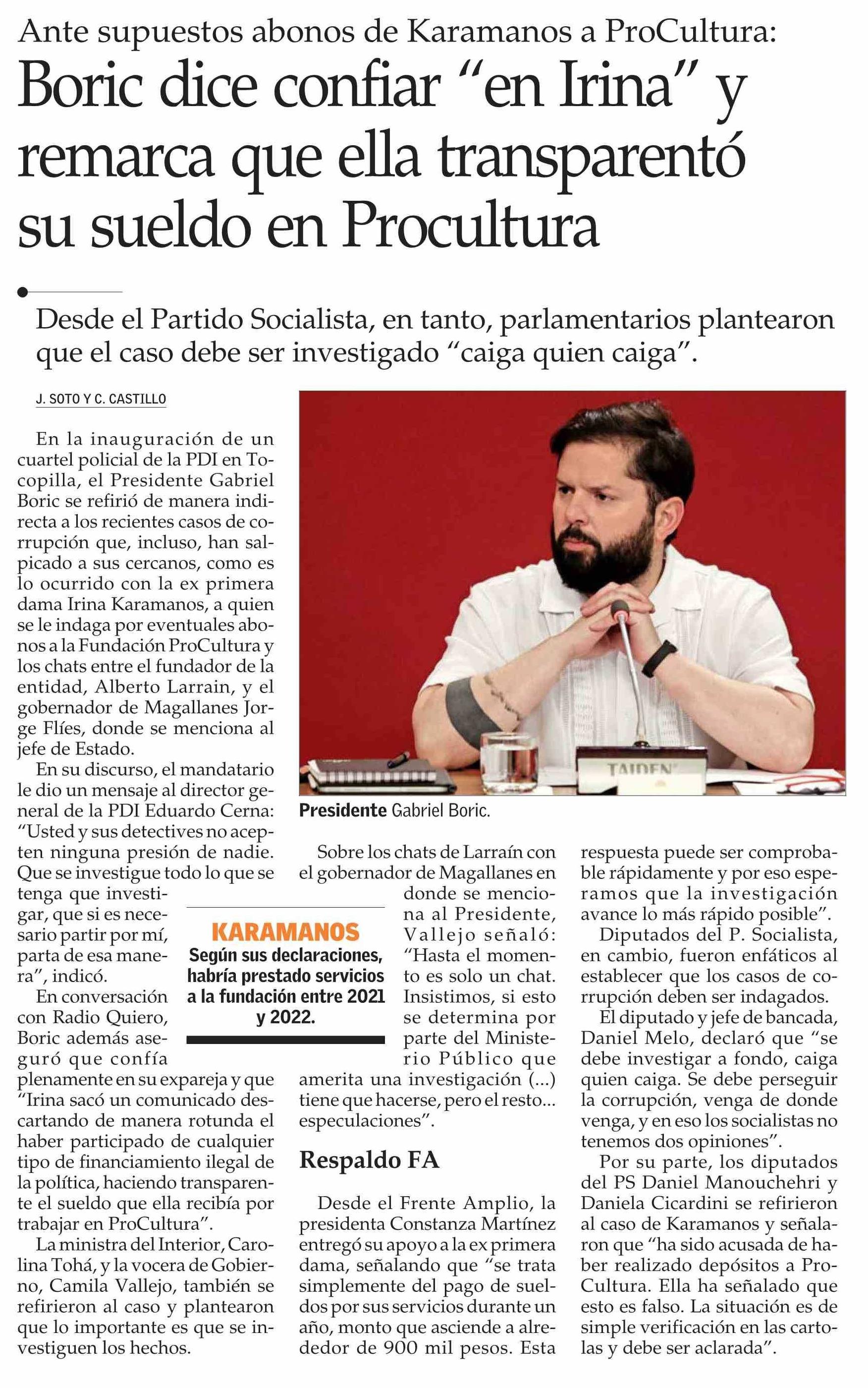Boric dice confiar “en Irina” y remarca que ella transparentó su sueldo en Procultura